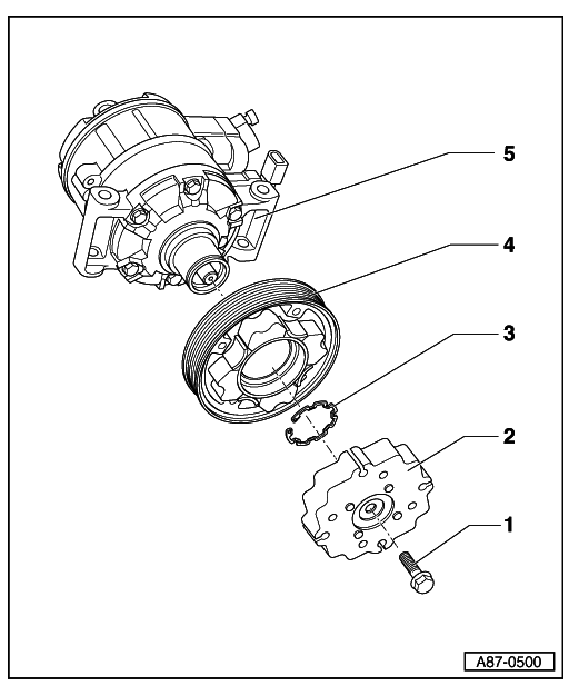Ok, c'est dommage de pas t'être défendu à l'époque, tu le sauras (surtout que c'est une règle générale que les pros essaient de t'entuber, mais s'ils voient que tu connais la légalité ils arrêtent) Concernant le bricolage, des conseils général déjà : - Pour tester ce qui est électronique, il te faudrait un vagcom. C'est un cable spécial que tu connectes entre ton PC et ta voiture (via la prise OBD située sous le volant), qui te permet d'interroger ta voiture à la recherche de défaut. Ca serait déjà une première étape pour voir si l'électronique a enregistré quelque chose (ça te permettrait de voir si l alimentation est coupée aussi justement) -Mécanique : Sur ma voiture (mais qui est une 2.0), la pompe à eau est entrainée par la distribution. Donc pas forcément la peine de changer la pompe à eau (sauf à faire la distribution en même temps qui comprend une courroie, galet enrouleur, galet tendeur, eventuellement poulie damper en même temps, et pompe à eau en même temps) La courroie multipiste (ou accessoire) entraine : l'alternateur, la pompe à palette (= pompe à vide de la direction assistée), elle passe par l'amortisseur de vibration (=poulie damper, tu peux eventuellement la remplacer sans toucher à la distribution, c'est assez facile), et la climatisation. La il y a à nouveau un galet enrouleur et un galet tendeur. (Différents de ceux de la distribution). Je sais pas combien de km ta voiture a, mais à mon avis si le climatiseur a cassé mécaniquement, ça serait pas mal de changer la poulie damper (qui limite les vibrations sur toutes les autres poulies), et eventuellement courroie / galet enrouleur / galet tendeur, comme ça tu pars avec un ensemble d'entrainement des accessoires tout neuf. Sinon, ton compresseur avec sa poulie ressemble à ça : La poulie entrainée par la courroie (le 4) a une partie en caoutchouc qui casse en cas de trop forte solicitation (exemple compresseur grippé). Ca peut protèger ton compresseur (= c est la poulie qui casse et pas le compresseur). Un premier test que tu peux faire c'est ouvrir ton capot et voir si la roue tourne librement : Active ta clim. Ensuite : Si le caoutchouc a cassé, la poulie 4 tourne librement, sans entrainer la partie n°2 de ce que je comprends. La solution pour réparer, c'est de démonter, et vérifier que l'arbre du compresseur tourne bien facilement. Si ce n'est pas le cas : Le compresseur est grippé, il faut le remplacer aussi. Si c'est le cas : c'est que le caoutchouc a cassé suite à une irrégularité du moteur, il te faut juste remplacer la poulie 4. Edit : cela dit, les conseils que je viens de te donner sont valable sur la mienne (moteur 2.0). Je pense que c'est pareil sur la tienne cela dit. Mais la meilleure façon de savoir réparer ta voiture, c'est soit acheter la revue technique de ta voiture [edit modération : hors charte] -