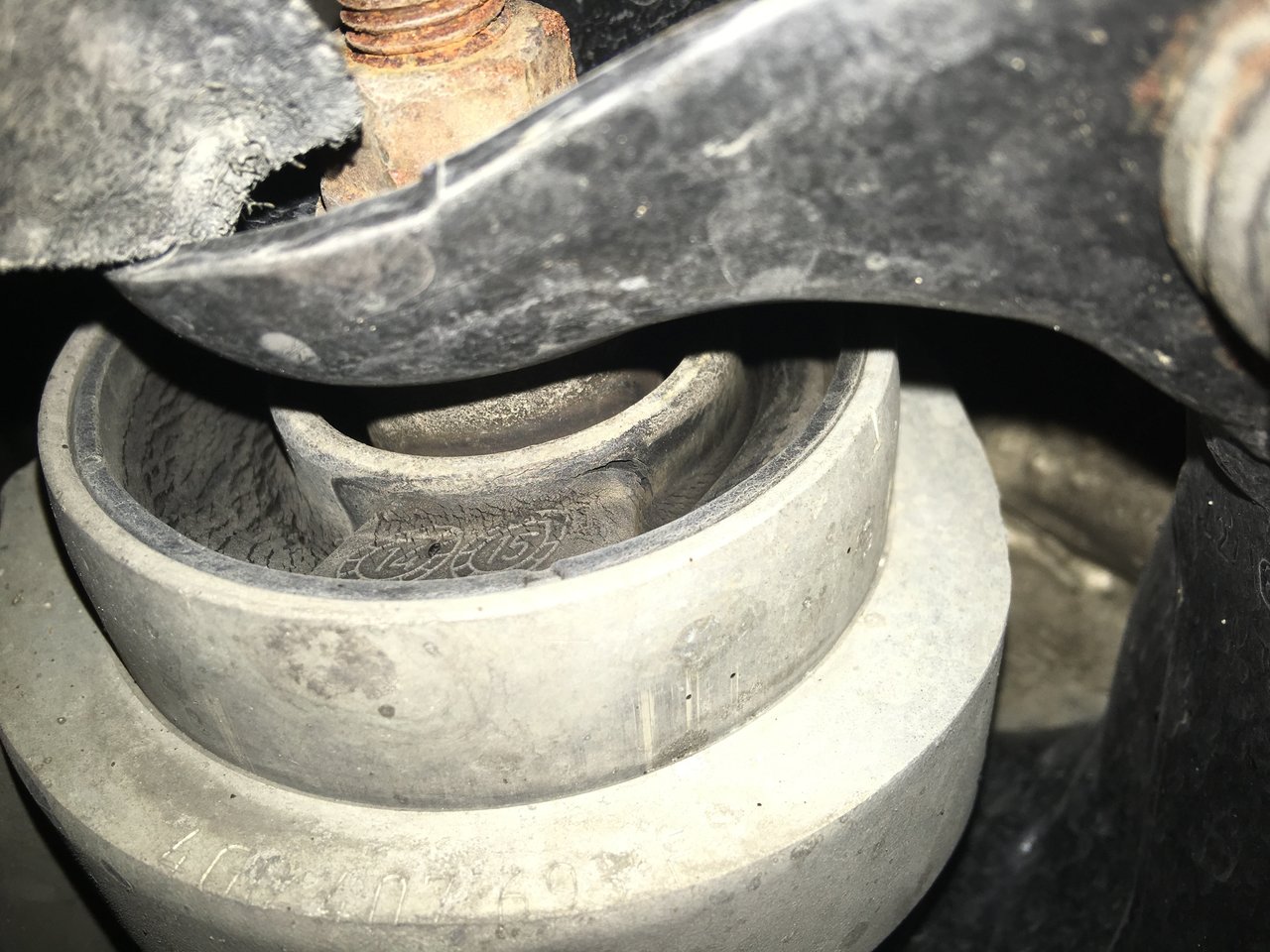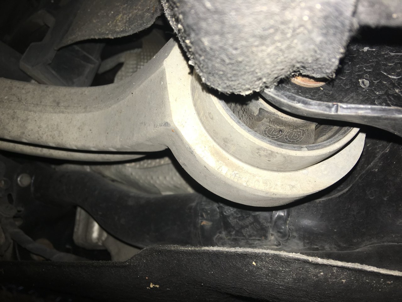 L'efficacité du produit pour moi est là, assez impressionnant pour ne pas dire miracle dans mon cas car plus de problème de fap depuis. Donc j'ai passé un peu de temps sous la voiture pour voir le problème décrit sur le CT, "Deterioration d'un Silentbloc de liaison du chassis ou a l'essieu, AVD, AVG." J'ai donc réussit tant bien que mal à enfoncer mon telephone pour prendre quelques clichés et voila le résultat. Je pense qu'il parle de celui la, mais vu la tete de la vis/boulon, je me demande si je vais pas laisser le mécano s'en occuper. On peut pas dire, les gars du CT cherche dans les détails. Mais le nom de cette piece ? 4G0407183B : Suspension, bras de liaison arrière, inférieur, des deux côtés de l'essieu avant? -