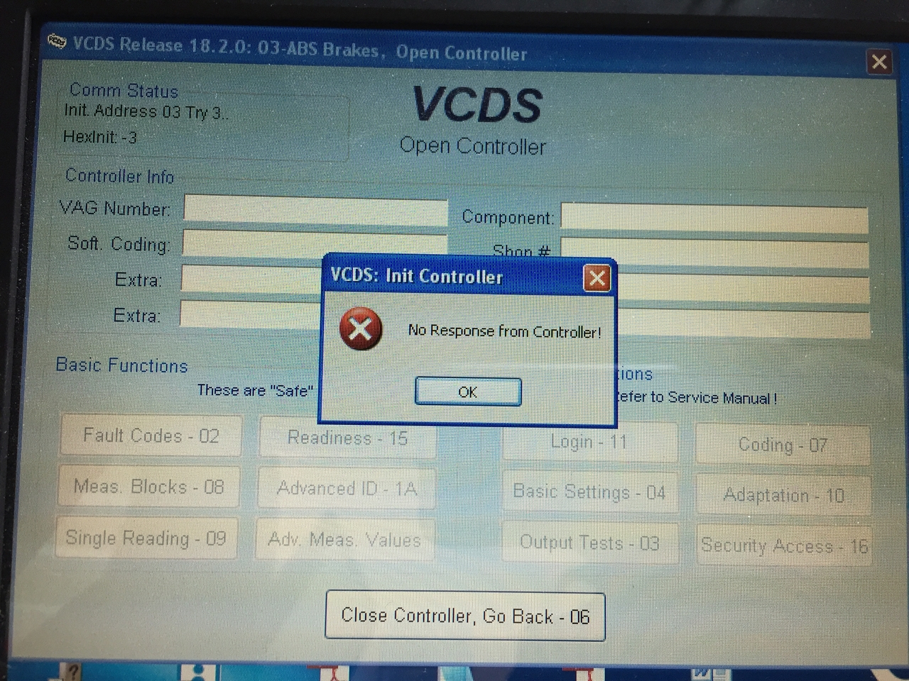 Quand je tente d’interroger les modules : - 03 ABS brakes - 09 cent élec - 15 airbag VCDS fait trois tentatives et termine par un message indiquant qu’il n’est pas possible de contacter le module interrogé...