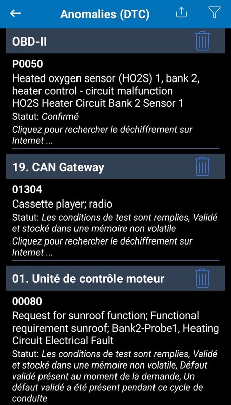Après avoir connecté la prise, j’ai lancé un nouveau scan. Le résultat est presque identique au scan précédent, hormis que maintenant le calculateur d’Airbag est présent. Rien de nouveau concernant l’abs... Le calculateur d’airbag est présent, mais il communique mal :