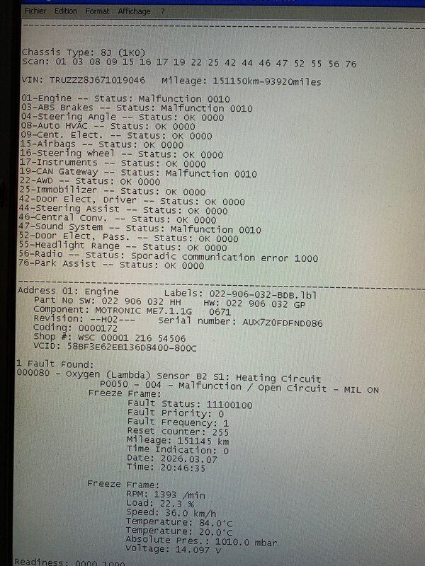 Bonjour à tous! Je roule toujours avec l’audi A4, sur laquelle j’avais fait un sujet concernant le remplacement des AAC des poussoirs. Nous avons dépassé les 450 000km, sans soucis depuis 😅. J’aurai besoin d’aide maintenant au sujet de ce qui me semble être un soucis électronique. J’ai toujours connu cette voiture avec les témoins d’Abs Et d’airbag allumés. Aussi, pour réussir mon CT, il va falloir les éteindre et si possible, réparer les disfonctionnements. Je me suis équipé de VCDS et j’ai fait un autoscan que j’en vais poster ici. En essayant le mode « manuel », je ne suis pas parvenu à connecter les calculateurs d’abs et d’airbag. Pensez-vous qu’ils puissent tout simplement ne plus être alimentés? Fusible? Merci pour votre aide! Le scan : Wednesday,06,February,2019,17:11:38:00006 VCDS -- Windows Based VAG/VAS Emulator Running on Windows XP x86 VCDS Version: 18.2.0.3 Data version: 20180212 DS287.0 www.Ross-Tech.com Mileage: 450710km-280058mi Repair Order: -------------------------------------------------------------------------------- -------------------------------------------------------------------------------- Chassis Type: 8D - Audi A4/S4/RS4 B5 (1995 > 2002) Scan: 01 02 03 08 15 16 17 25 35 37 45 55 56 57 67 75 76 77 Mileage: 450710km-280058miles ------------------------------------------------------------------------------- Address 01: Engine Labels: 059-907-401-AKE.clb Part No: 8D0 907 401 H Component: 2.5l/4VT EDC G00SG D42 Coding: 02002 Shop #: WSC 06325 VCID: 29594BA6D3F9240C6F-4B18 1 Fault Found: 18259 - Powertrain Data Bus P1851 - 35-10 - Missing Message from ABS Controller - Intermittent Readiness: N/A ------------------------------------------------------------------------------- Address 08: Auto HVAC Labels: 8L0-820-043-2D.lbl Part No: 8L0 820 043 D Component: A4 KLIMAVOLLAUTOMAT_D75 Coding: 04163 Shop #: WSC 06325 VCID: 29594BA6D3F9240C6F-25A4 7 Faults Found: 00779 - Outside Air Temp Sensor (G17) 30-10 - Open or Short to Plus - Intermittent 00603 - Footwell/defroster Flap Positioning Motor (V85) 41-10 - Blocked or No Voltage - Intermittent 01272 - Positioning Motor for Central Flap (V70) 41-10 - Blocked or No Voltage - Intermittent 01271 - Positioning Motor for Temperature Flap (V68) 41-10 - Blocked or No Voltage - Intermittent 01274 - Air Flow Flap Positioning Motor (V71) 41-10 - Blocked or No Voltage - Intermittent 01273 - Fresh Air Blower (V2) 17-10 - Control Difference - Intermittent 01206 - Signal for Duration of Ignition Off Time 27-10 - Implausible Signal - Intermittent ------------------------------------------------------------------------------- Address 17: Instruments Labels: 8D0-919-xxx-17.lbl Part No: 8D0 919 880 MX Component: B5-KOMBIINSTR. VDO D20 Coding: 05160 Shop #: WSC 04140 VCID: 14270A52647B89E4AC-513C Subsystem 1 - Part No: IMMO Component: IDENTNR: AUZ7Z0E2731396 IMMO-IDENTNR: AUZ7Z0E2731396 No fault code found. ------------------------------------------------------------------------------- Address 35: Centr. Locks Labels:. 8D0-862-257.lbl Part No: 8L0 862 257 K Component: ZV-Pumpe, Funk D06 Coding: 12864 Shop #: WSC 06325 VCID: 3D718FF63771A8AC33-4F02 3 Faults Found: 01367 - Central Locking Pump Run Time Exceeded (Likely Leak) 35-00 - - 01366 - Opened Due to Crash Signal 35-00 - - 00955 - Key 1 09-00 - Adaptation Limit Surpassed End-------------------------(Elapsed Time: 05:12)--------------------------