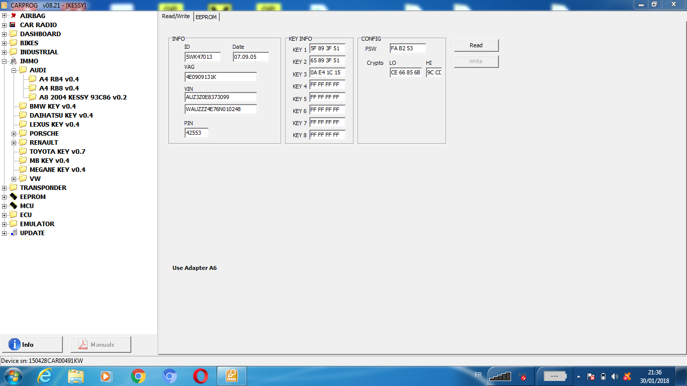 Bonsoir Redeline974 Et encore merci pour ton aides je suis en déplacement donc vendredi je vais jeter un coup d'œil au dump que tu m'a mis merci si je comprend bien il faut que je l'insert dans carprog et que j'écris les donner dans le kessy d'occasion et après sa j'aurais du contact et pas de soucis Avé. Lz colonne de direction et lezs ? Merci Ps : Si non je ne peut pas faire plus simple dessoudage de leprom effacement du dump et réinjecter le dump dans leprom comme sa pas de problème ? Merci Et autre question est se possible de mettre un vierge au cas ou que sa ne passe pas comme sa je fait un télécodage avec odis voir même Avé. Vcds ? Si oui si tu a la possibilité de me poster un vierge au cas ou comme sa j'ai une autre roue de secours merci d'avance et tkt je ferais un retour merci merci et bonne soirée cdrl -