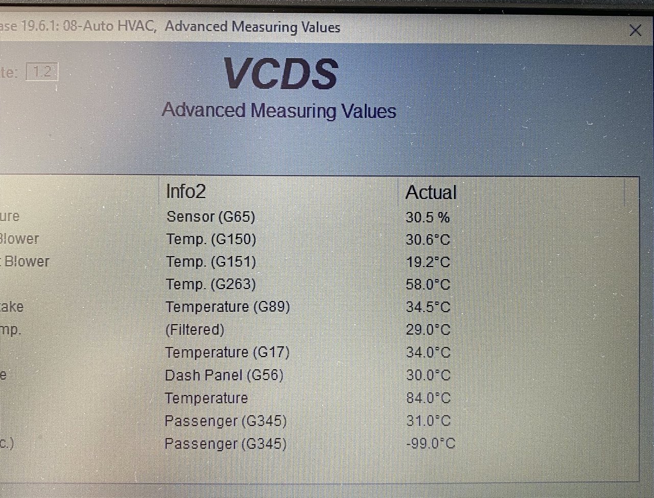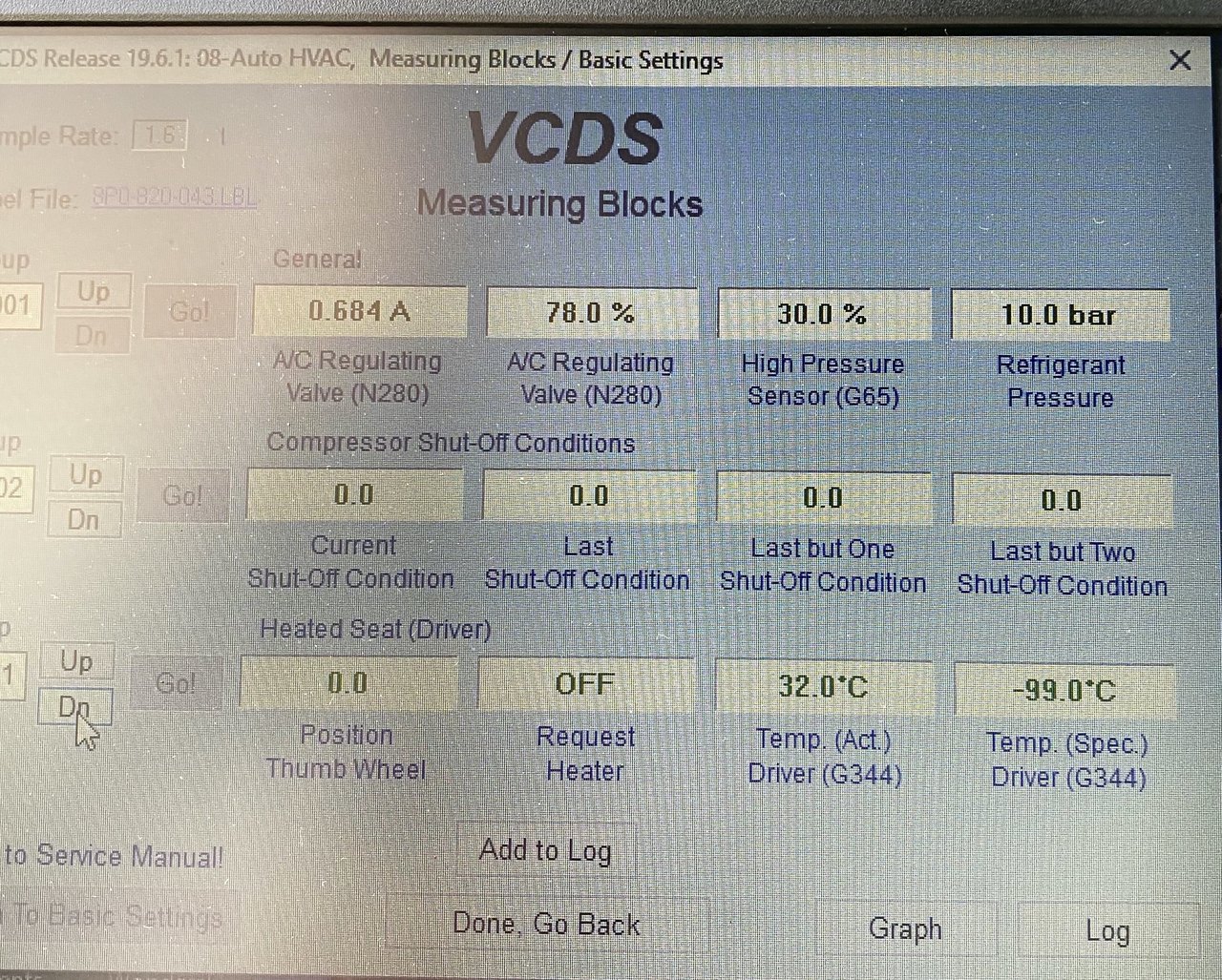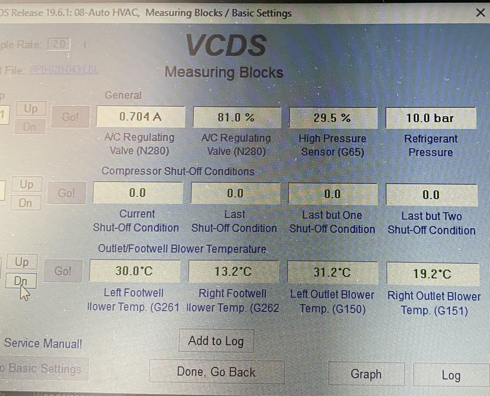 Bonjour à tous, J'ai un souci avec l'a3 de ma femme, depuis quelque mois je n'ai plus de clim, elle ne fait plus de froid. Je précise c'est une A3 2L TDI 140 de 2005 moteur BMM compresseur de clim Sanden PXE16 8675, elle affiche 308000km. Il y a du gaz dans le circuit et la poulie n'ai pas desserrée. J'ai fait une extraction à la VAGCOM et quelque recherche plus précise mais je n'arrive pas à savoir si mon compresseur est HS. L'électrovanne de régulation N280 fonctionne correctement. Lorsque la clim est sur OFF la pression relevé à la VAGCOM est de 6 bars et lorsque je la met en route en LOW la pression monte à 10 bars, je ne sais pas si sait suffisent. J'ai également une sonde de T° qui m'affiche -99°C. Pouvez vous m'aider? Merci Mileage: 307740km-191220mi Repair Order: Chassis Type: 8P (1K0) Scan: 01 02 03 08 09 15 16 17 18 19 25 37 42 44 46 47 52 55 56 62 69 72 76 77 7D VIN: WAUZZZ8P06A079107 Mileage: 307740km-191220miles 00-Steering Angle Sensor -- Status: OK 0000 01-Engine -- Status: OK 0000 02-Auto Trans -- Status: OK 0000 03-ABS Brakes -- Status: OK 0000 08-Auto HVAC -- Status: Malfunction 1010 09-Cent. Elect. -- Status: OK 0000 15-Airbags -- Status: OK 0000 16-Steering wheel -- Status: Malfunction 0010 17-Instruments -- Status: OK 0000 18-Aux. Heat -- Status: Malfunction 0010 19-CAN Gateway -- Status: Malfunction 0010 25-Immobilizer -- Status: OK 0000 37-Navigation -- Status: OK 0000 42-Door Elect, Driver -- Status: Malfunction 0010 44-Steering Assist -- Status: OK 0000 46-Central Conv. -- Status: Malfunction 0010 47-Sound System -- Status: OK 0000 52-Door Elect, Pass. -- Status: OK 0000 55-Headlight Range -- Status: OK 0000 56-Radio -- Status: OK 0000 62-Door, Rear Left -- Status: OK 0000 69-Trailer -- Status: OK 0000 72-Door, Rear Right -- Status: OK 0000 76-Park Assist -- Status: Malfunction 0010 77-Telephone -- Status: OK 0000 7D-Aux. Heat -- Status: Malfunction 0010 ------------------------------------------------------------------------------- Address 01: Engine Labels: 03G-906-021-BMM.clb Part No SW: 03G 906 021 AA HW: 028 101 226 2 Component: R4 2,0L EDC G000AG 8007 Revision: --H01--- Serial number: AUX7Z0E8FNQ0EF Coding: 0000078 Shop #: WSC 48097 141 81801 VCID: 5EB32B7F89379CBFCB-800A No fault code found. Readiness: 0 0 0 0 0 ------------------------------------------------------------------------------- Address 02: Auto Trans Labels: 02E-927-770.clb Part No SW: 02E 300 042 S HW: 02E 927 770 AE Component: GSG DSG 070 1129 Revision: 04507000 Serial number: 00000701090658 Coding: 0000020 Shop #: WSC 44551 111 44551 VCID: 23455A8BE2D5F157A4-8076 No fault code found. ------------------------------------------------------------------------------- Address 03: ABS Brakes Labels:. 1K0-614-517-MK60AT.clb Part No SW: 1K0 614 517 R HW: 1K0 614 517 R Component: ESP FRONT MK60-AT 0103 Revision: 00T12001 Coding: 0039554 Shop #: WSC 06314 000 00000 VCID: 366393DF414774FF73-8062 No fault code found. ------------------------------------------------------------------------------- Address 08: Auto HVAC Labels: 8P0-820-043.lbl Part No SW: 8P0 820 043 L HW: 8P0 820 043 L Component: KlimavollautomatH17 0200 Revision: 021381 Serial number: 8P0820043L Shop #: WSC 06314 000 00000 VCID: 356194D35C417FE77A-8060 2 Faults Found: 01207 - Control Module for Auxiliary Heater (J364) 013 - Check DTC Memory Freeze Frame: Fault Status: 01101101 Fault Priority: 3 Fault Frequency: 1 Reset counter: 167 Mileage: 248210 km Time Indication: 0 Date: 2016.01.30 Time: 15:35:01 Freeze Frame: ON 00483 - Control Module for Auxiliary Air Heater 013 - Check DTC Memory Freeze Frame: Fault Status: 01101101 Fault Priority: 3 Fault Frequency: 1 Reset counter: 204 Mileage: 307112 km Time Indication: 0 Date: 2020.03.18 Time: 20:38:53 Freeze Frame: ON ------------------------------------------------------------------------------- Address 09: Cent. Elect. Labels:. 8P0-907-279-23-H.lbl Part No SW: 8P0 907 279 F HW: 8P0 907 279 F Component: Bordnetz-SG H36 1201 Revision: 00H36000 Serial number: 00000002222261 Coding: F58A5FB99714100000160000160081000009FF18321500 Shop #: WSC 06314 123 08192 VCID: 408FF5071383CA4FD9-8014 Subsystem 1 - Part No: 8P1 955 119 B Labels: 1KX-955-119.CLB Component: Wischer AU350 H01 0130 Coding: 00062736 Shop #: WSC 06314 Subsystem 2 - Part No: 4E0 910 557 Labels: 8K0-955-559.CLB Component: REGENLICHTSENSORH10 0050 Coding: 00207422 Shop #: WSC 06314 No fault code found. ------------------------------------------------------------------------------- Address 15: Airbags Labels: 8P0-959-655-94.lbl Part No SW: 8P0 959 655 C HW: 8P0 959 655 C Component: Airbag 9.41 H12 3760 Revision: 91H12376 Serial number: 00362004P535 Coding: 0073722 Shop #: WSC 06314 000 00000 VCID: 428BFF0F1D8FD85FCF-8016 Subsystem 1 - Serial number: 6332DRB4021A4A0DN Subsystem 2 - Serial number: 6342DRB401638E13K Subsystem 3 - Serial number: 63528RB400A9EE46. Subsystem 4 - Serial number: 63628RB400AB0EDB/ Subsystem 5 - Serial number: 63729RB400AB5655P Subsystem 6 - Serial number: 63829RB400AB561CT No fault code found. ------------------------------------------------------------------------------- Address 16: Steering wheel Labels: 8P0-953-549-F.lbl Part No SW: 8P0 953 549 F HW: 8P0 953 549 F Component: J0527 H36 0070 Coding: 0014142 Shop #: WSC 12345 123 12345 VCID: 4189F0031889C347D6-8014 Subsystem 1 - Part No: XXXXXXXXXXX Component: E0221 H07 0080 1 Fault Found: 01301 - Control Module for Voice Recognition (J507) 004 - No Signal/Communication - Intermittent ------------------------------------------------------------------------------- Address 17: Instruments Labels: 8P0-920-xxx-17-MY7.lbl Part No SW: 8P0 920 930 R HW: 8P0 920 930 R Component: KOMBIINSTR. VDO H80 0410 Revision: D04 Serial number: 2248ED04036240 Coding: 0000043 Shop #: WSC 00012 000 00000 VCID: 4189F0031889C347D6-8014 No fault code found. ------------------------------------------------------------------------------- Address 18: Aux. Heat Labels: 1K0-815-