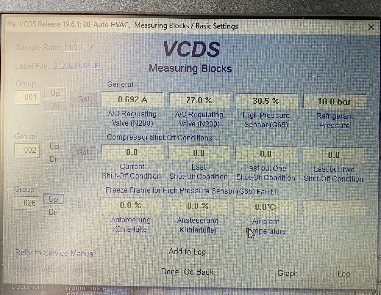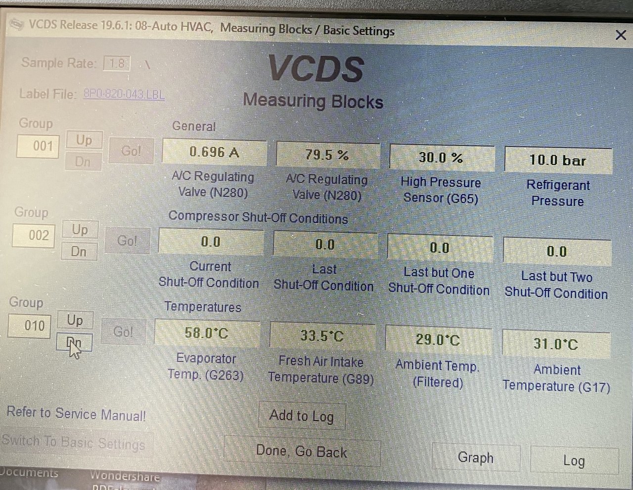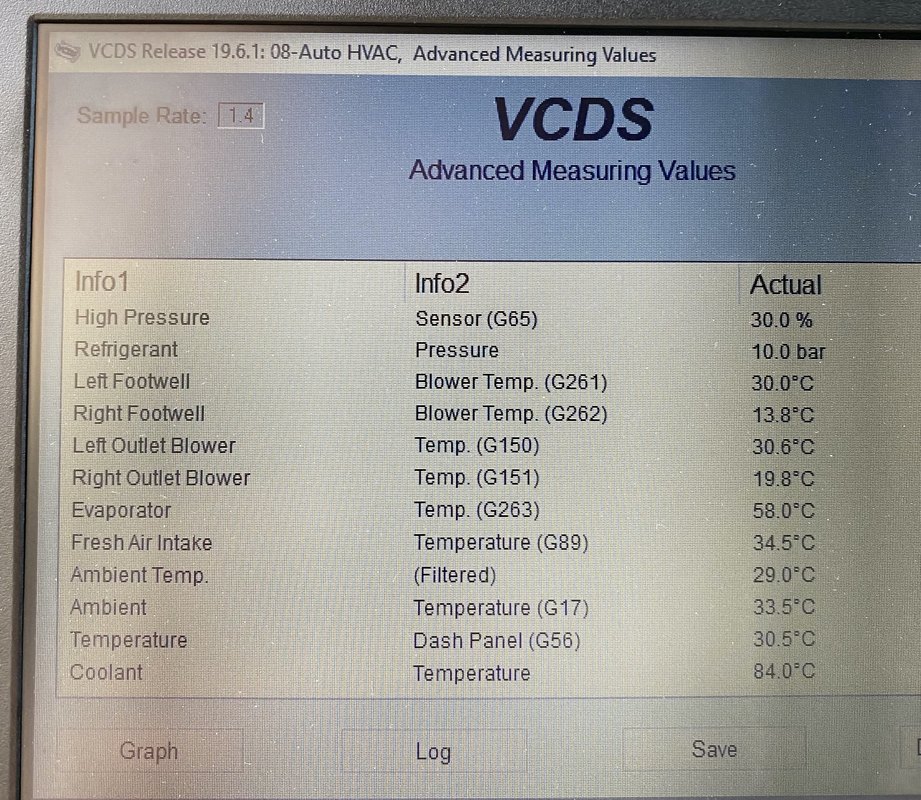 Bonjour à tous, J'ai un souci avec l'a3 de ma femme, depuis quelque mois je n'ai plus de clim, elle ne fait plus de froid. Je précise c'est une A3 2L TDI 140 de 2005 moteur BMM compresseur de clim Sanden PXE16 8675, elle affiche 308000km. Il y a du gaz dans le circuit et la poulie n'ai pas desserrée. J'ai fait une extraction à la VAGCOM et quelque recherche plus précise mais je n'arrive pas à savoir si mon compresseur est HS. L'électrovanne de régulation N280 fonctionne correctement. Lorsque la clim est sur OFF la pression relevé à la VAGCOM est de 6 bars et lorsque je la met en route en LOW la pression monte à 10 bars, je ne sais pas si sait suffisent. J'ai également une sonde de T° qui m'affiche -99°C. Pouvez vous m'aider? Merci Mileage: 307740km-191220mi Repair Order: Chassis Type: 8P (1K0) Scan: 01 02 03 08 09 15 16 17 18 19 25 37 42 44 46 47 52 55 56 62 69 72 76 77 7D VIN: WAUZZZ8P06A079107 Mileage: 307740km-191220miles 00-Steering Angle Sensor -- Status: OK 0000 01-Engine -- Status: OK 0000 02-Auto Trans -- Status: OK 0000 03-ABS Brakes -- Status: OK 0000 08-Auto HVAC -- Status: Malfunction 1010 09-Cent. Elect. -- Status: OK 0000 15-Airbags -- Status: OK 0000 16-Steering wheel -- Status: Malfunction 0010 17-Instruments -- Status: OK 0000 18-Aux. Heat -- Status: Malfunction 0010 19-CAN Gateway -- Status: Malfunction 0010 25-Immobilizer -- Status: OK 0000 37-Navigation -- Status: OK 0000 42-Door Elect, Driver -- Status: Malfunction 0010 44-Steering Assist -- Status: OK 0000 46-Central Conv. -- Status: Malfunction 0010 47-Sound System -- Status: OK 0000 52-Door Elect, Pass. -- Status: OK 0000 55-Headlight Range -- Status: OK 0000 56-Radio -- Status: OK 0000 62-Door, Rear Left -- Status: OK 0000 69-Trailer -- Status: OK 0000 72-Door, Rear Right -- Status: OK 0000 76-Park Assist -- Status: Malfunction 0010 77-Telephone -- Status: OK 0000 7D-Aux. Heat -- Status: Malfunction 0010 ------------------------------------------------------------------------------- Address 01: Engine Labels: 03G-906-021-BMM.clb Part No SW: 03G 906 021 AA HW: 028 101 226 2 Component: R4 2,0L EDC G000AG 8007 Revision: --H01--- Serial number: AUX7Z0E8FNQ0EF Coding: 0000078 Shop #: WSC 48097 141 81801 VCID: 5EB32B7F89379CBFCB-800A No fault code found. Readiness: 0 0 0 0 0 ------------------------------------------------------------------------------- Address 02: Auto Trans Labels: 02E-927-770.clb Part No SW: 02E 300 042 S HW: 02E 927 770 AE Component: GSG DSG 070 1129 Revision: 04507000 Serial number: 00000701090658 Coding: 0000020 Shop #: WSC 44551 111 44551 VCID: 23455A8BE2D5F157A4-8076 No fault code found. ------------------------------------------------------------------------------- Address 03: ABS Brakes Labels:. 1K0-614-517-MK60AT.clb Part No SW: 1K0 614 517 R HW: 1K0 614 517 R Component: ESP FRONT MK60-AT 0103 Revision: 00T12001 Coding: 0039554 Shop #: WSC 06314 000 00000 VCID: 366393DF414774FF73-8062 No fault code found. ------------------------------------------------------------------------------- Address 08: Auto HVAC Labels: 8P0-820-043.lbl Part No SW: 8P0 820 043 L HW: 8P0 820 043 L Component: KlimavollautomatH17 0200 Revision: 021381 Serial number: 8P0820043L Shop #: WSC 06314 000 00000 VCID: 356194D35C417FE77A-8060 2 Faults Found: 01207 - Control Module for Auxiliary Heater (J364) 013 - Check DTC Memory Freeze Frame: Fault Status: 01101101 Fault Priority: 3 Fault Frequency: 1 Reset counter: 167 Mileage: 248210 km Time Indication: 0 Date: 2016.01.30 Time: 15:35:01 Freeze Frame: ON 00483 - Control Module for Auxiliary Air Heater 013 - Check DTC Memory Freeze Frame: Fault Status: 01101101 Fault Priority: 3 Fault Frequency: 1 Reset counter: 204 Mileage: 307112 km Time Indication: 0 Date: 2020.03.18 Time: 20:38:53 Freeze Frame: ON ------------------------------------------------------------------------------- Address 09: Cent. Elect. Labels:. 8P0-907-279-23-H.lbl Part No SW: 8P0 907 279 F HW: 8P0 907 279 F Component: Bordnetz-SG H36 1201 Revision: 00H36000 Serial number: 00000002222261 Coding: F58A5FB99714100000160000160081000009FF18321500 Shop #: WSC 06314 123 08192 VCID: 408FF5071383CA4FD9-8014 Subsystem 1 - Part No: 8P1 955 119 B Labels: 1KX-955-119.CLB Component: Wischer AU350 H01 0130 Coding: 00062736 Shop #: WSC 06314 Subsystem 2 - Part No: 4E0 910 557 Labels: 8K0-955-559.CLB Component: REGENLICHTSENSORH10 0050 Coding: 00207422 Shop #: WSC 06314 No fault code found. ------------------------------------------------------------------------------- Address 15: Airbags Labels: 8P0-959-655-94.lbl Part No SW: 8P0 959 655 C HW: 8P0 959 655 C Component: Airbag 9.41 H12 3760 Revision: 91H12376 Serial number: 00362004P535 Coding: 0073722 Shop #: WSC 06314 000 00000 VCID: 428BFF0F1D8FD85FCF-8016 Subsystem 1 - Serial number: 6332DRB4021A4A0DN Subsystem 2 - Serial number: 6342DRB401638E13K Subsystem 3 - Serial number: 63528RB400A9EE46. Subsystem 4 - Serial number: 63628RB400AB0EDB/ Subsystem 5 - Serial number: 63729RB400AB5655P Subsystem 6 - Serial number: 63829RB400AB561CT No fault code found. ------------------------------------------------------------------------------- Address 16: Steering wheel Labels: 8P0-953-549-F.lbl Part No SW: 8P0 953 549 F HW: 8P0 953 549 F Component: J0527 H36 0070 Coding: 0014142 Shop #: WSC 12345 123 12345 VCID: 4189F0031889C347D6-8014 Subsystem 1 - Part No: XXXXXXXXXXX Component: E0221 H07 0080 1 Fault Found: 01301 - Control Module for Voice Recognition (J507) 004 - No Signal/Communication - Intermittent ------------------------------------------------------------------------------- Address 17: Instruments Labels: 8P0-920-xxx-17-MY7.lbl Part No SW: 8P0 920 930 R HW: 8P0 920 930 R Component: KOMBIINSTR. VDO H80 0410 Revision: D04 Serial number: 2248ED04036240 Coding: 0000043 Shop #: WSC 00012 000 00000 VCID: 4189F0031889C347D6-8014 No fault code found. ------------------------------------------------------------------------------- Address 18: Aux. Heat Labels: 1K0-815-