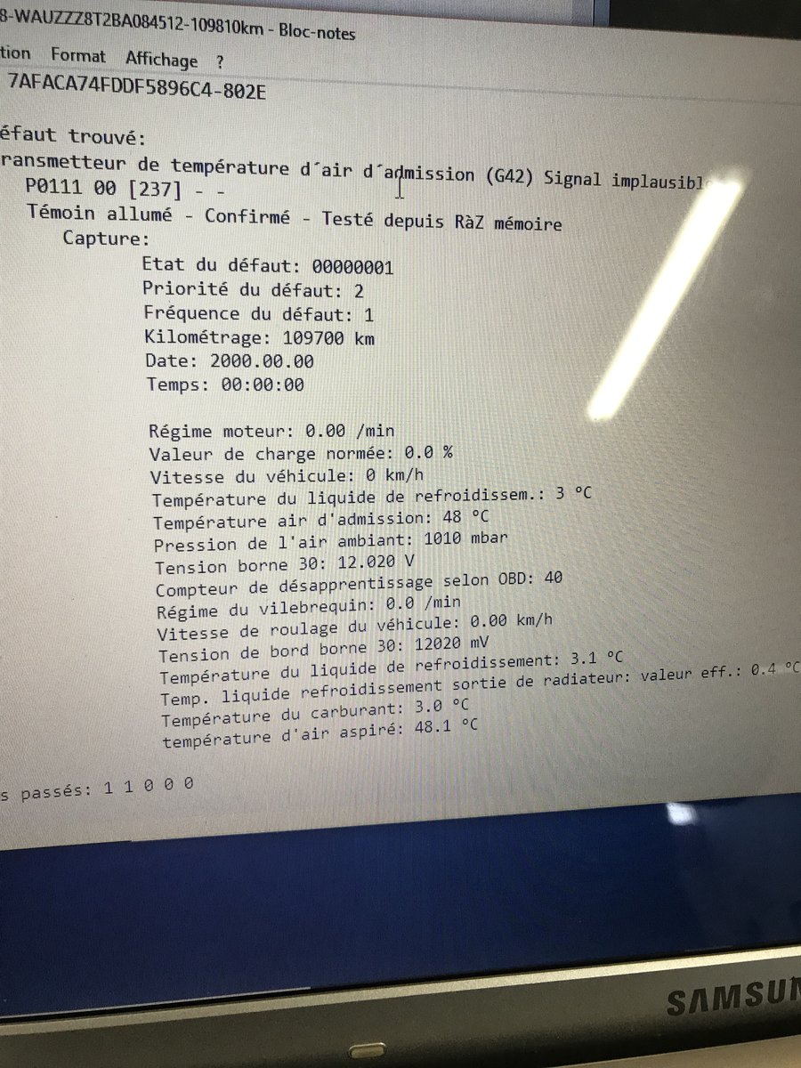 J’ai un soucis depuis ce matin sur Mon A5 le voyant moteur c’est allumer. Mon amis me la passer au vagcom et en est sortie l’erreur suivante voir photo donc G42 c’est le capteur de temperature d’air d’admission qui et celui aussi du capteur G31 de capteur de pression de suralimentation du turbo. Pas de perte de puissance etc.