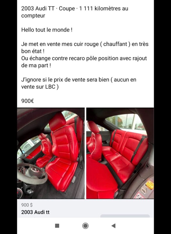 Youcef la vendu avec l’intérieur d’origine. le proprio d’après a vendu le cuir rouge à mis des pole po et a acheter un demi arceau là remise en vente juste après avec un intérieur rouge et a revendu l’arceau et les pole po et là le gars revend le cuir pour des pole po 😂 -