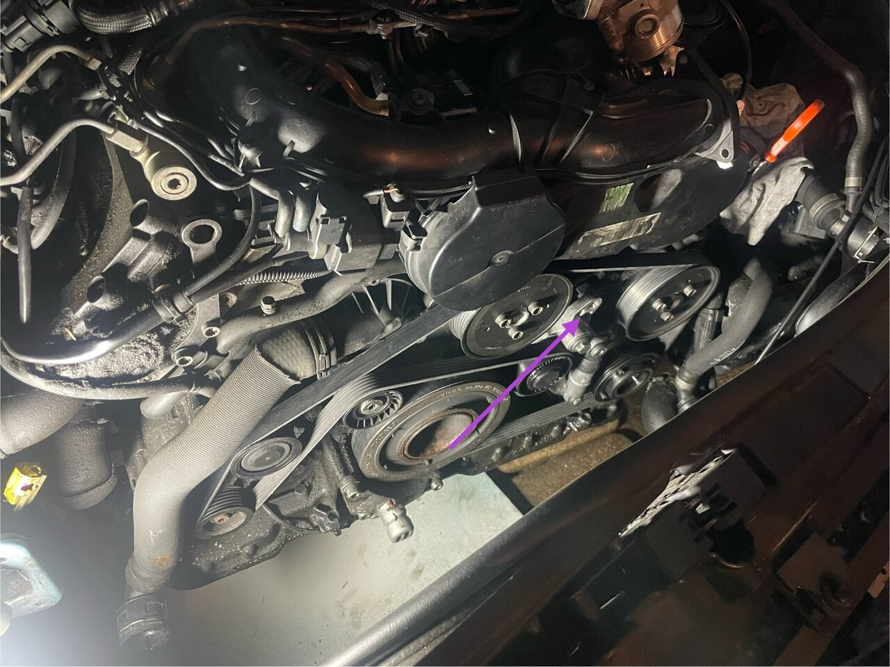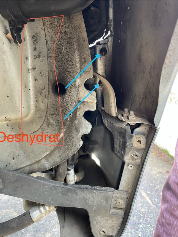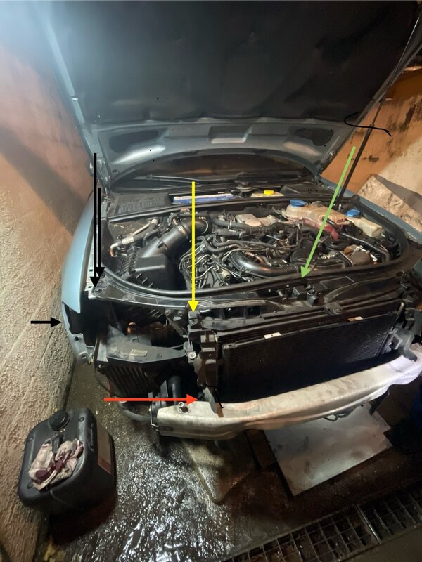 Je complète le sujet déjà bien complet du forum https://forums.audipassion.com/topic/170052-v6-30-tdi-remplacement-courroie-daccessoires/page/2/ demontage PC Les 6 vis de tour de plaque on sort plaque et support en rouge derrière la plaque le deshydrateur Flèches bleues les deux écrous qui tiennent le PC (accessible en tombant le pare-boue Flèches noires les 6vis qui tiennent le masque droite et gauche Verte le câble de capot attention la petite agrafe jaune la pige qui tient le radiateur idem de l’autre côté Au niveau de la traverse on démonte les prises de klaxons ,les deux grosses vis 12 pans bien visible , sortir la traverse fleche rouge la durite de Clim au niveau de son radiateur flèche rouge on Démonte la prise du radiateur les vis de butoirs 3 torx et un écrou bouteille déshydratante neuve cheminement courroie d acs sur 3.0tdi code bkn flèche violette on prend appui sur l’étoile pour relâcher le tendeur de courroie en complément du sujet ouvert et de celui du forum amicalement -