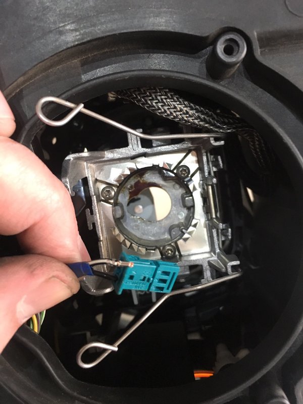 Champagne pour la première alors ;P je n'ai pas encore régler le problème mais le faux contact me semble la piste la plus plausible. Avec un appui latéral léger sur le culot d'ampoule, le plein phare marchait. donc l’électroaimant du volet est ok. j'ai voulu débrancher le câble qui me semble être celui qui commande le volet pour faire des mesures mais pas réussi (pourtant pas de système de blocage de prise en apparence). Par contre après ça, le plein phare ne s’enclenche plus avec un appui sur le culot, je pense donc avoir fini de rompre le contact bancal. J'ai donc trois questions: -le gainage du câble repéré sur la photo me semble étrange, c'est comme ca à l'origine ou cela a déjà été bidouillé? -les ballasts peuvent ils détériorer les ampoules si fatigués ou ca lâche d'un coup? -quelqu'un sait il localiser l'arrivée du câble fautif? je préfèrerai percer le phare pour réparer et refaire une étanchéité du trou plutôt que d'ouvrir le phare (merci au tuto pour virer les cabochons oranges ^^ ) Encore merci de vos retour :) -