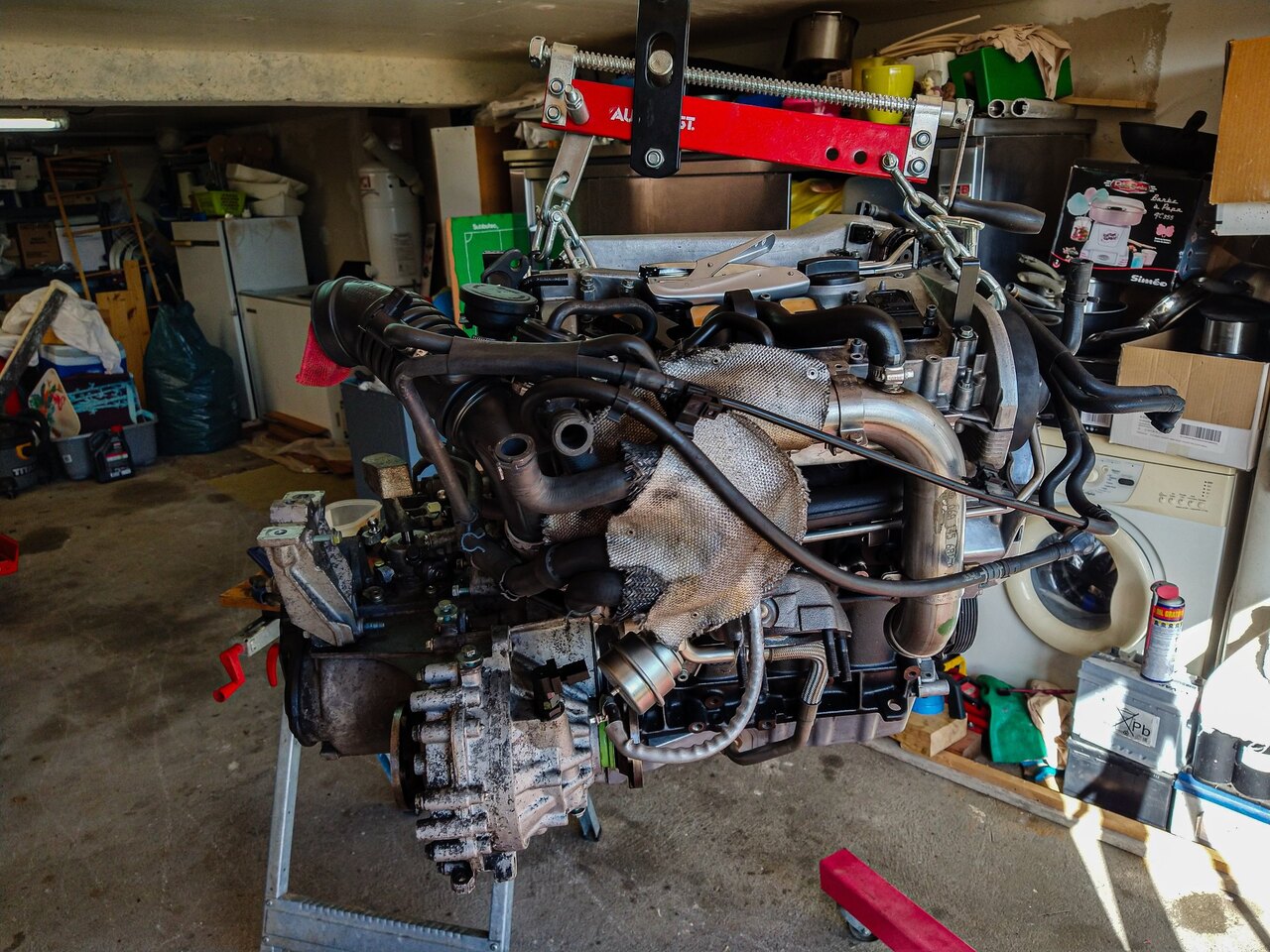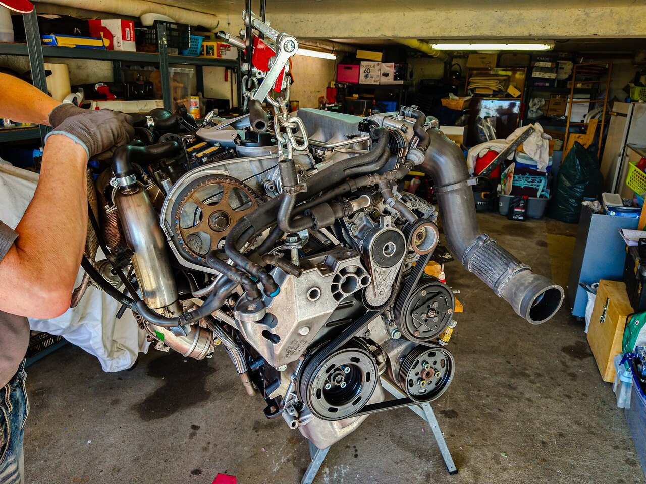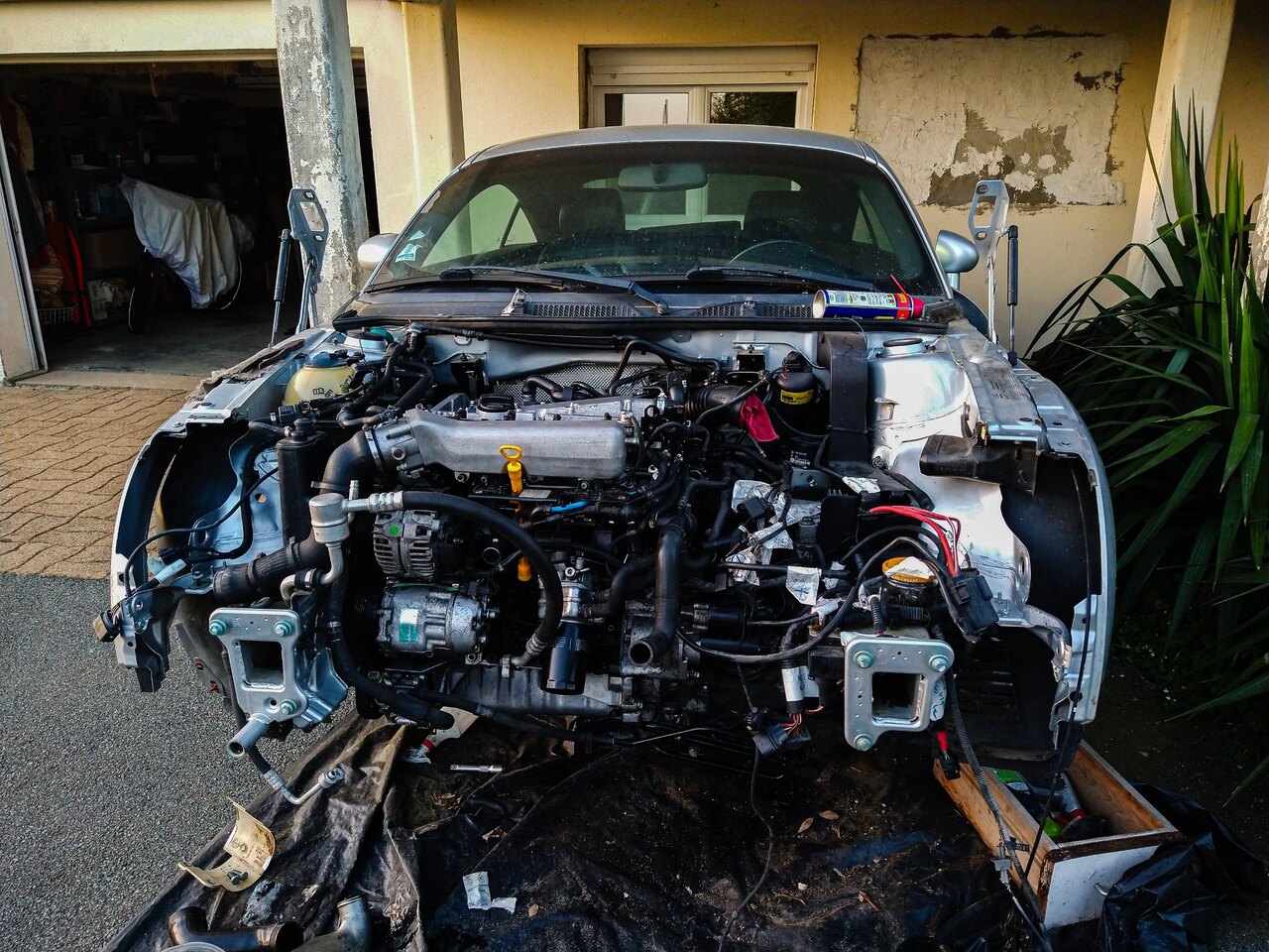 Bonjour à toutes et à tous, Je viens vous apporter des news a propos du projet. J’ai pu m’y remettre ce weekend avec l’aide précieuse de mon père. Donc on a commencé par mettre cette fameuse visse M7 en place et remis l’ensembles des accessoires. Ensuite on a remis quelques colliers et on a remis les protections thermiques. On a sorti le moteur du garage (ce qui n’était pas facile ^^) et on a préparé la voiture à re-recevoir el motor ! (non ma voiture ne repose pas sur ses jantes, rassurez vous) Tout s’est bien goupillé et on a pu remettre l’ensemble des capteurs et durites. Bon … Dans la foulée, on a dû refaire le « capteur » sur le couvre culasse qui a pris son indépendance… C’est un truc qui permet d’enlever les interférences de l’allumage. On a remis de l’huile dans le moteur, du liquide de DA et de l’huile dans la boite. On a remis la tringlerie de boite toute neuve. On a amorcé le moteur en huile. Un câble, une batterie et hop ça tourne. On entend bien les compressions et je confirme (pour la 7 fois je pense) que rien est en train d’applaudir dans celui-ci. Ensuite, on a remis le radiateur mis de l’eau et remplis tout ça avec du G12. On a réinstallé la boite à air, l’intercooler, … Bon bah … Je crois que l’on peut démarrer… Je monte dans la voiture pleine de moisissure du fait de ses 1ans et demis d’immobilisation et je démarre. Tout fonctionne bien. Le moteur a quelques ratés, mais l’essence est très vieille donc je pense que ça vient de là. Pas de voyant moteur ! = Nickel Plus de bruit de poussoirs au bout de 5 minutes = Nickel Le circuit d’eau qui se purge entièrement = Nickel La température d’eau qui est à 100°C et pas de ventilo qui fonctionne = Eh M**** Je commence à regarder tout ça de plus près et j’ai ma durite en haut du radiateur qui est bouillante, et la durite du bas qui est froide. Je regarde un peu sur internet et j’ai une piste pour le calorstat… Du coup, j’ai acheté un cardans et calorstat. Je me sens un peu bête d’investir autant d’argent de temps et de me dire : « ouais ! Faisons une économie de 9,50€… » La prochaine fois, quand je retournerai là-bas pour bosser sur la voiture (normalement le 4-5 mai) Je réparerais mes erreurs. Le point positif c’est qu’elle démarre et que tout va bien (si on fait l’exception de la surchauffe). Et vous savez le pire dans tout ça ? C'est que j'ai même pas pris l'apéro ! Mais, j’ai deux petites questions : La première, c’est pour le contrôle technique. Le mien est périmé depuis 1 ans et je sais que les contrôleurs montent dans les régimes pour faire le test pollution. Est-ce que c’est « risqué » pour mon moteur ? Est-ce que je le fais tourner pendant plusieurs heures avant de l’amener au contrôle (par exemple pour mettre la partie direction et suspension) ? La deuxième question concerne les cardans. Est-ce que quelqu’un connait les valeurs de couple de serrage des visse au niveau de la boite et au niveau du moyeux ? A bientôt !