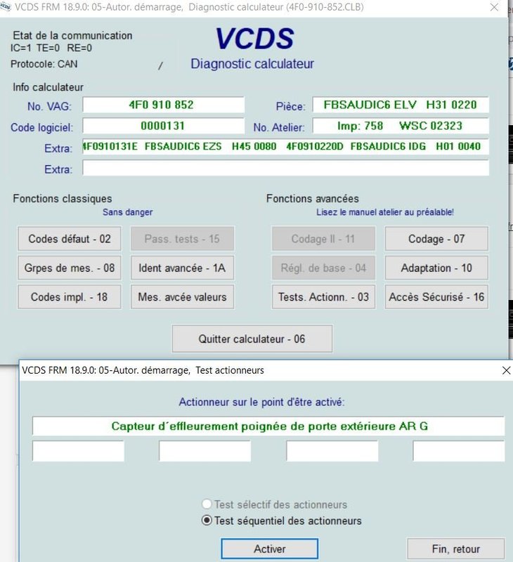 Nouvelle série d'essais... J'ai eu un défaut dans le calculateur 4F - Centrale Elect II, j'ai pu l'effacer. Mais toujours rien au 05: Autor. démarrage - - - - - 00456 - Calculateur pour accès et autorisation de démarrer (J518) 004 - Aucun(e) signal / communication - Intermittent Capture: Etat du défaut: 00100100 Priorité du défaut: 3 Fréquence du défaut: 1 Compteur de RAZ: 229 Heure: 0 Capture: Tension: 12.100 V non détecté Par contre j'ai fait un test d'actionneurs du calculateur 05 et quand j'ai activé le test du capteur d'effleurement de la poignée de porte AR gauche, le moteur a démarré... Je ne pense pas avoir ce type de capteurs sur mon A6 puisque je n'ai pas le keyless. Ça craint ! -