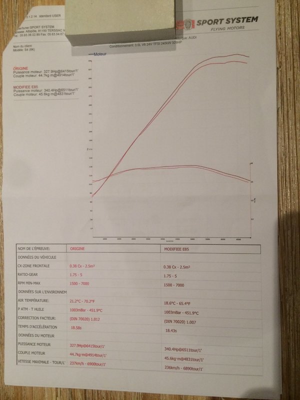 bonjour Ludovic qu'est ce que tu veux dire ? oui c'est la feuille de banc je ne m'y connais pas du tout en voiture !!! je veux juste rouler à l'éthanol pour des raisons économiques, c'est tout !!! 333 CV ça me convient largement , je n'arrête pas de me faire contrôler. Le garage me dit que c'est une pompe qui est déficiente à l'éthanol !!! tu pense que c'est la reprog qui était mauvaise ??? -