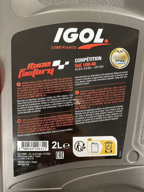 127606 kms compteur Mon mécano vient de faire la vidange huile avec de la 10W60 IGOL. Pour les amours des comparatifs d'huile voici l'huile qui sera dorénavant dans ce moteur: https://www.igol.com/catalogue/race-factory-competition-lubrifiant-moteur-huile-10w60/ tds-race-factory-competition-10w-60-2021-04-fr-nv.pdf -