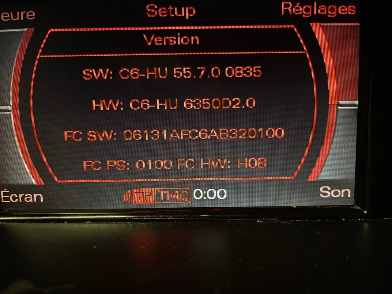 Hello à tous. J'avais posé ma question sur le forum A5 B8 mais il se trouve qu'il a mieux sa place ici. J'ai fait quelques recherches avant mais rien trouvé de similaire. Je viens d'acquérir une A5 B8 de 2008 avec ce qu'il semblerait être un MMI 2G High (voir photo). Je dis semblerait car je n'arrive pas à avoir une réelle confirmation avec en comparant avec les infos sur le net. Ce MMI m'intrigue un peu car il m'est impossible de valider le changement d'heure, à chaque fois que je le fais il se remet automatiquement à zéro, également pour des réglages comme la lumière tamisé ou encore la date. Impossible également de lire le niveau d'huile même en ayant roulé suffisamment, je l'ai vu affiché une fois cependant en laissant le capot ouvert. Ma question est de savoir si il est possible de le mettre à jour pour le réinitialiser (via CD ou VAGCOM) voir de le remplacement totalement (par un modèle au dessus) J'aimerai aussi installer un CarPLay compatible mais n'étant pas certain de ma version je préfère être sûr. Une image de la version en pj Merci à vous !