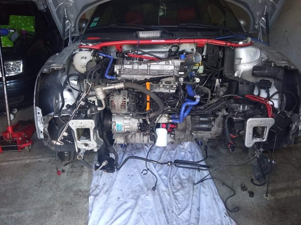Pr les durites avia arriere il faut limite tomber le train arriere ou au moins le desserer pr gagner un peu d espace pr la durite de turbo il y a un tuyau d eau rigide qui passe devant le turbo et qui gene le passage de la durite cette durite rigide est tenu avec une patte vissee sur le bloc devisses la au max sans enlever la vis et tire un peu dessus pr laisser un peu d espace C est tres juste mais ca passe et il faut prendre le bon angle apres vu que t as pris le gros modele ca risque d etre encore plus compliqué et pr la serrer au turbo il faut mieux etre 2 un au dessus pr maintenir la durite en place et un en dessous pr visser le collier tout seul c est galere car il faut serrer un peu le collier par dessous remonter dessus pr verifier la durite redescendre pr serrer etc -