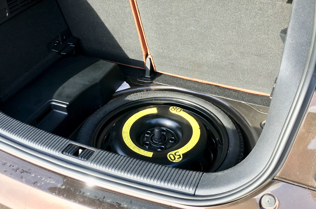 La roue galette de l'A1 est 125/60R18 (et non pas 125/70R18 comme on peut rencontrer souvent en vente, qui est en fait la taille des roues de l'A3) Elle est rare, très rare, difficile à trouver. J'ai dû moi-même improviser pour l'avoir, j'ai acheté la jante (partagée par plusieurs modèles VAG : 1J0601027M 5x100 3,5Jx18 ET38) séparément du pneu (125/60R18 unique pour l'A1, un seul modèle disponible - Continental). La roue galette y rentre sans souci dans les coffres avec batterie et/ou avec l'ampli Bose. Il reste même de l'espace de rangement.