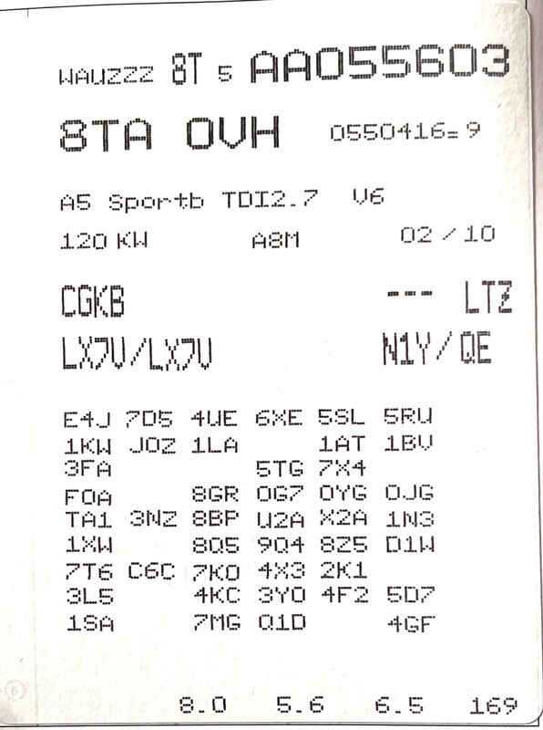 Hello les amis ! Depuis hier, j'ai quitté mon A6 C5 (2,5 V6 Quattro TDI de 2002) pour une A5 Sportback de 2010; une 2,7 V6 TDI Boite auto. Enchantée par la belle ! Je constate les progrès réalisés entre une Audi de 2002 et une autre de 2010; alors bien sûr on est sur 2 gammes différentes. L'A6 typée routière et l'A5 SB typée sport c'est indéniable ! J'ai mis en photo les codes des options. Seriez-vous en mesure de déchiffrer les options et les lister sur ce post ? Merci d'avance et excellent WE à tous ! -