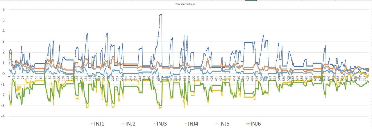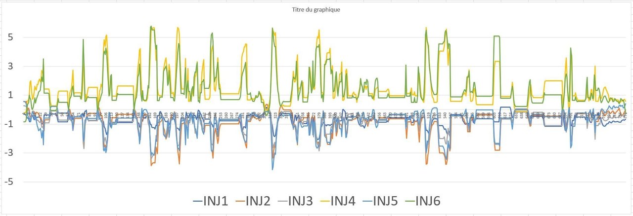 Et voila remontage du cache culbuteur après reception du joint. Remontage des 3 injecteurs Purge du circuit au VCDS Démarrage 10-15s a chercher pour finalement démarrer. Essaie routier de 15mn avec VCDS pour controle des débits des injecteurs Pour rappel lorsque je passais les 3000 tours la voiture se mettait en sécurité, perte de puissance et voyant orange au TDB, suite à ça passage au VCDS et injecteurs 4 et 6 dépassait tranquillement les 5mg. J'ai tout démonté, nettoyé chaque injecteur et changé les joints. Et voila le résultat du test routier. Tout est rentré dans l'ordre, l'injecteur 1 a dépassé les 5mg pendant 7s, sur 15mn je ne sais pas si c'est très significatif. En tout cas la voiture n'a rien signalé, j'ai fait quelques accélérations franches en montant, puis une autre fois sur la voie rapide. J'ai dépassé les 4500 tours et RAS. Je suis content! je conserve tout de même pendant quelques jours les 2 injecteurs que j'avais reçu au cas ou ^^ -