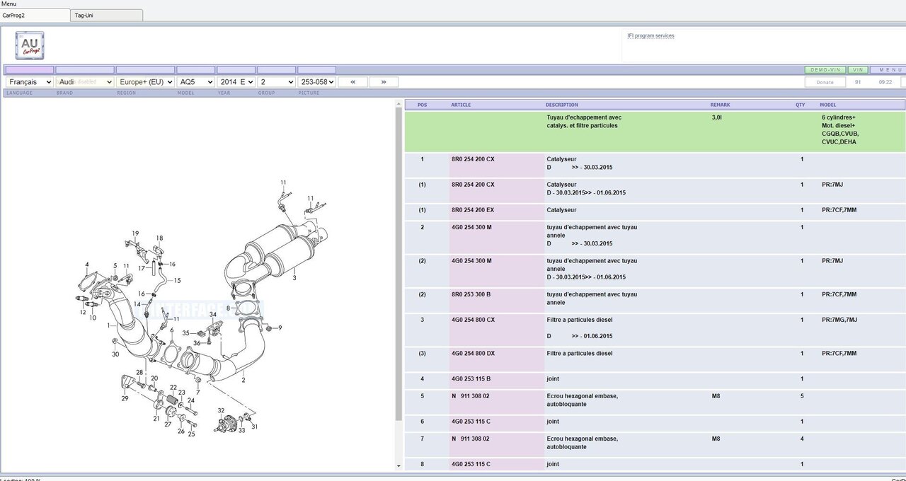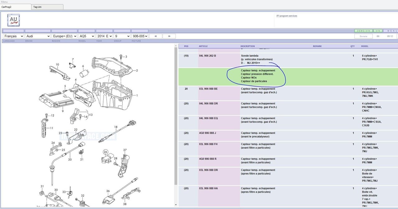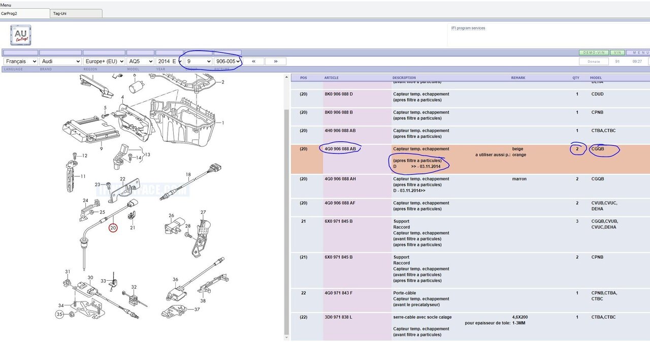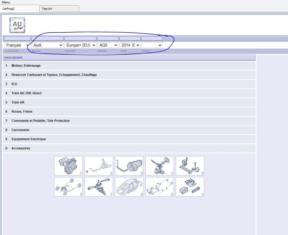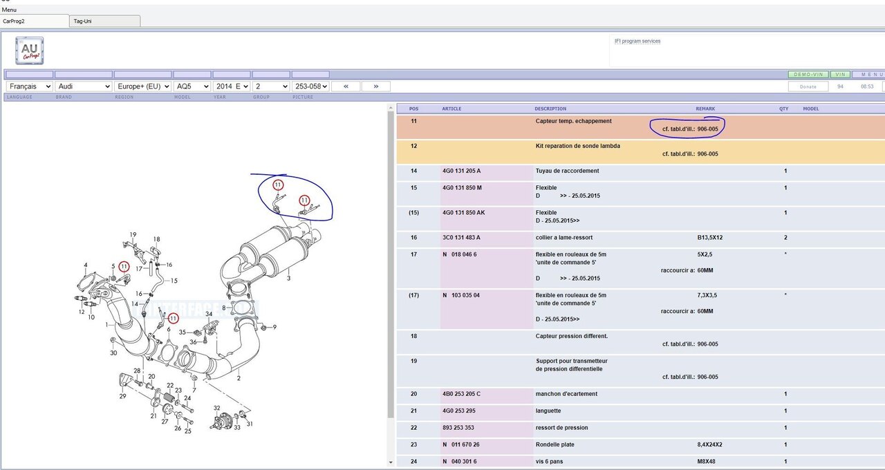 Salut à tous, Cherchant la réf d'une sonde de température je suis tombé sur une logiciel vraiment pas mal. Carprog2 ETKA https://ifinterface.com/page/page3.php?langid=1 Donc vous prenez le logiciel DLinker1 qui correspond avec votre windows 32 ou 64 bits et 7 8 10 11 ou précédentes. Vous décompressez l'archive et vous lancez DLinker1.exe Vous cliquez sur CarProg2 Dans les menus déroulants vous choisissez Audi Europe AQ5 et votre année, moi 2014 Et vous arrivez sur toutes les parties de la voiture Ma pièce étant une sonde de température des gaz d'echappement j'ai choisi le 2 Et j'ai cherché dans la liste a droite ce qui correspondait "Tuyau d'echappement avec catalys. et filtre particules Il suffit de cliquer sur votre pièce et ça vous amène directement a la ref. Bon la je n'ai pas eu de bol il a fallu que j'aille chercher dans un tableau annexe ref 906-005 Dans les menu déroulant j'ai donc mis sur 9 et j'ai choisi 906-005 Et la ben il a fallu chercher un peu, dans la partie capteur de température Dans les descriptions je savait que c'était après le FAP, ma voiture est d'avril 2014, quantité il y en a 2 et modèle c'est CGQB (CGQB mention trouvé en D.2 sur la carte grise) Et voila Il y a les autres marques du groupe dans le logiciel. En espérant que cela puisse aider certaines personnes -