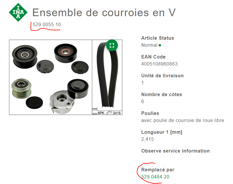 C'est bon, j'ai trouvé le catalogue... C'est tout simple en fait : https://aftermarket.schaeffler.com/en/catalog/auto-parts/belt-drive/belt-pulley/v-ribbed-belt-set/p-TA-542-5290055100 En Français via clic droit google trad, donc te fie pas trop au texte technique traduit de l'anglais... Donc le 70€ est le remplaçant du 157€, achète le 70€ hein -