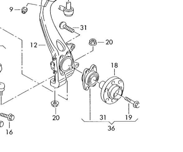 Hello les gens, Dites moi, qques ptites questions... Il semblerait que j'ai un début de prob de roulement avant (à droite, mais si je fais, ce sera les 2 vu la gueule du soufflet de cardan avant gauche), mais je suis pas sur de ce que j'ai (vu que j'ai pas envie de démonter pour aller voir...). J'ai donc trouver cette video : https://www.youtube.com/watch?v=T0RrLyV4U_E Mais sur Nemigpart (7zap m'est inutilisable depuis des mois...) je ne vois pas le roulement qu'il change sur la vidéo : https://nemigaparts.com/fr/cat_spares/etka/audi/a6q/264/407040/ Il semblerait que ce soit la pièce 31 : Hors dans la vidéo, cette pièce 18 s'emboite dans un roulement (qui serait le 31 (4D0505445), mais sans le ceinturage) qui est installé dans le porte fusée. Donc est-ce la voiture de la vidéo qui n'est pas comme la mienne (c'est une phase 1 et surement une 1.9l car les étriers sont plus petit que les miens) ou le schéma omet une pièce ? Et je présume quand dans les 2 cas, je dois tomber le porte fusée pour le sortir le roulement à la presse ? (j'ai envie d dire non dans le 2eme cas) Quel est le couple de serrage de la vis 19 ? Sur quel rapport de la boite auto je la mets quand je dévisse cette vis ? (un pote m'a dit que quand elle est levée il fallait éviter de faire tourner les roues si elle n'est pas en N, au risque de faire du mal à la boite). Merci -