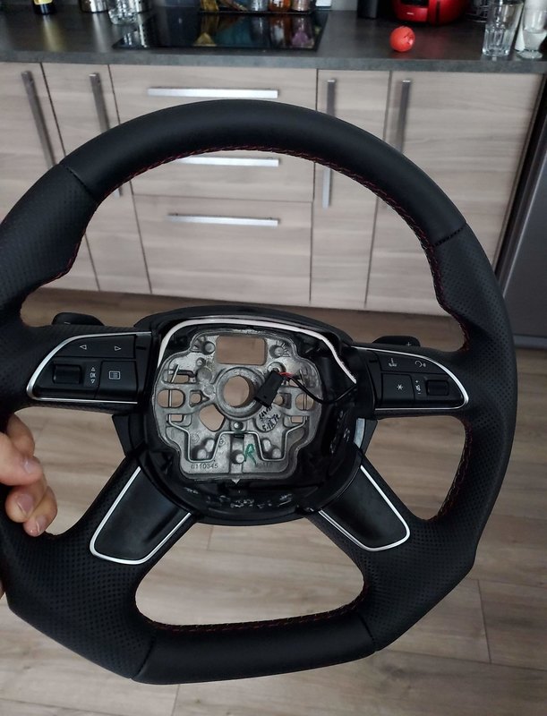 Voici le new volant avec une belle finition ( couture en rouge pour un jolie effet sport/class ) Avant/Après pour voir le volant d'avant ( La 1ere photo c'était pendant l'installation les tweeters ) En tout cas, le volant une merveille.... -