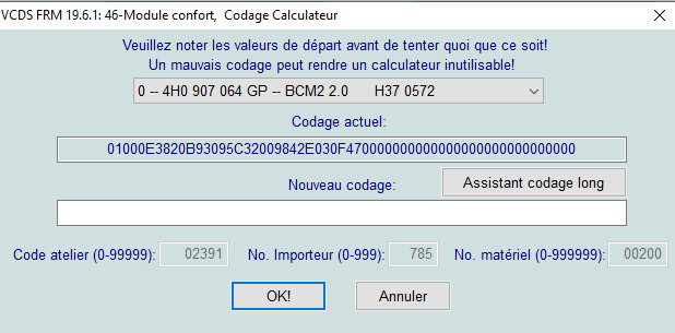 OK, c'est bien ca, Labels est a none, il ne reconnait pas ta version. Si tu as bien un fichier nommé "4G1-035-MIB-HGH2.CLB" dans ton repertoire "Labels" ou est installé VCDS, copie ce fichier dans le repertoire "Labels\User" (ce repertoire est normalement vide, mis a part un fichier readme) ==> 4G-5F.lbl Je l'ai mis en version decrypté, ce sera plus simple pour le faire évoluer si d'autres ont besoin d'y ajouter leur version. 4G-5F.lbl 4G1-035-MIB-HGH2.clb -