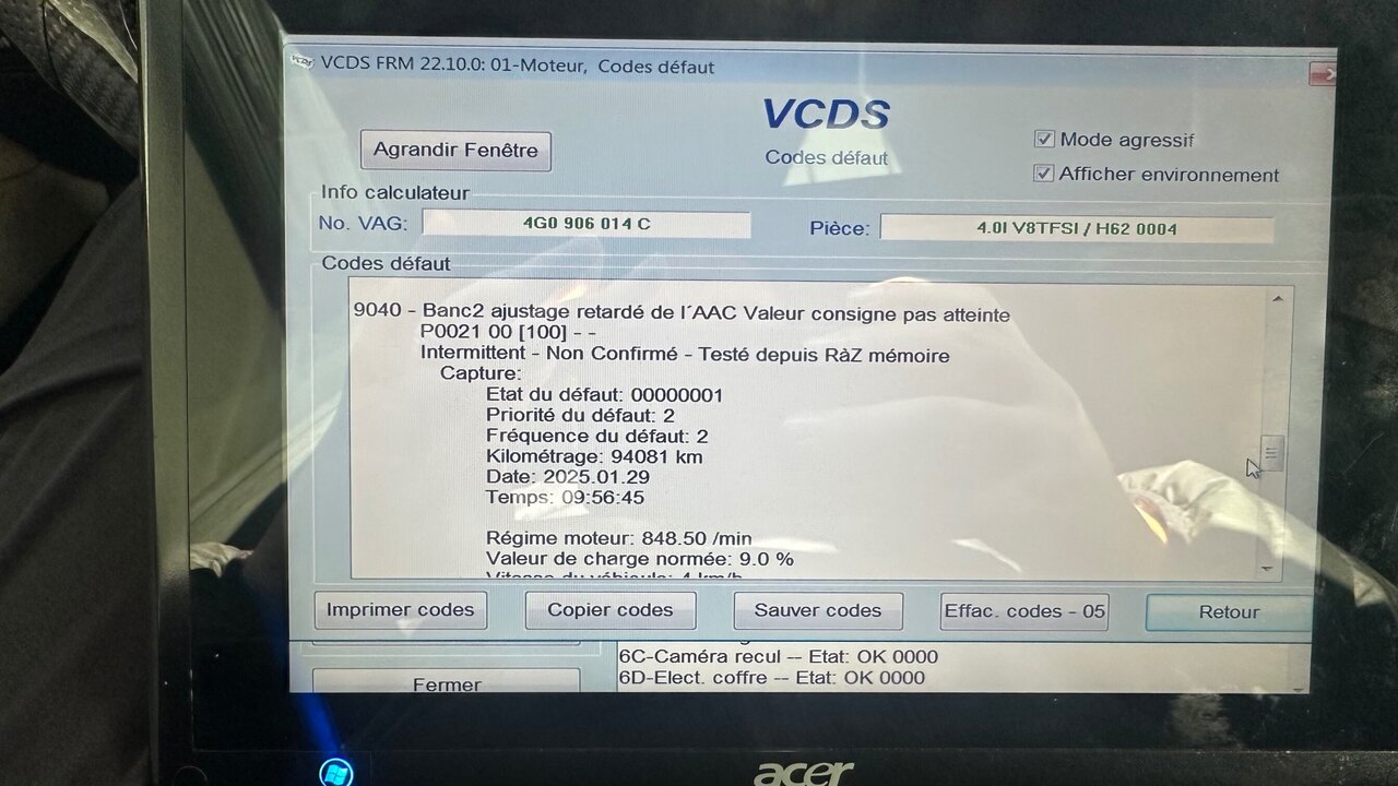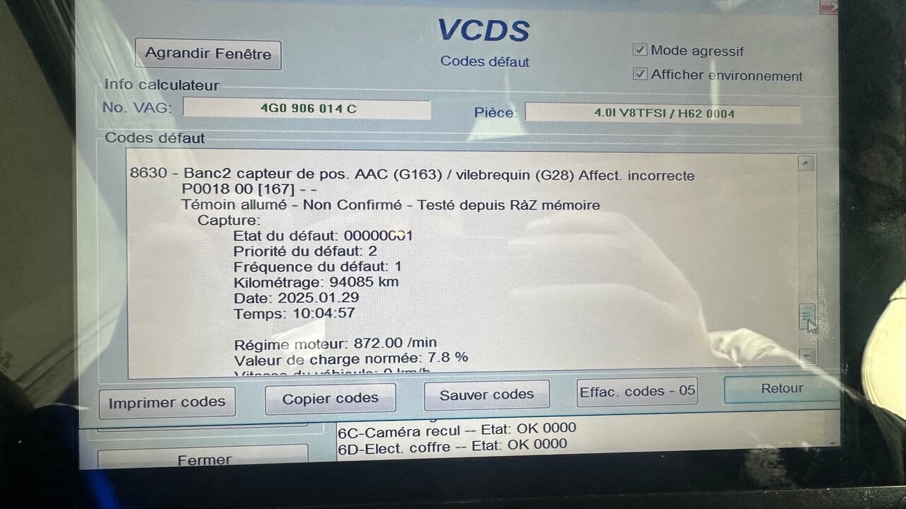 Sujet : Problème calage distribution Audi S7 4.0 TFSI (codes P0018 & P0021) – Besoin d’aide et d’un bon garage Bonjour à tous, Je possède une Audi S7 2015 (4.0 TFSI) avec 90 000 km et j’ai un problème de calage de distribution. Voici les symptômes et ce qui a été fait jusqu’à maintenant : Symptômes & Codes Erreur : • Voyant moteur allumé avec les codes P0018 (corrélation vilebrequin/arbre à cames banc 2) et P0021 (calage avancé arbre à cames banc 2). • Le moteur est limité à 4000 tr/min (mode sécurité). • Les défauts reviennent immediately après effacement. • Pas de bruit suspect de la distribution, et la voiture roule bien même à haute vitesse (200 km/h). Tests et interventions effectués : • Vidange + remplacement du filtre à huile → Pas d’amélioration. • Contrôle des capteurs CMP (arbre à cames), CKP (vilebrequin) et solénoïdes VVT N208 → Tout semble OK. • Test des solénoïdes VVT via VCDS → Les solénoïdes fonctionnent correctement. • Mesure du calage chez Audi → Le calage est incorrect et varie à chaque démarrage. Hypothèses possibles : • Tendeur de chaîne défectueux, ce qui pourrait expliquer la variation du calage. • Problème du système VVT (calage variable). • Autre problème mécanique lié à la chaîne de distribution. Ce que je cherche : 1. Des retours d’expérience : Avez-vous déjà eu ce problème avec un moteur 4.0 TFSI ou sur une Audi S7 / RS7 ? 2. Un garage compétent : Connaissez-vous un garage (en France) capable de réparer ce genre de problème ? Je suis près de Saint-Rémy-de-Provence, mais je peux me déplacer. Merci d’avance pour vos réponses et conseils ! -