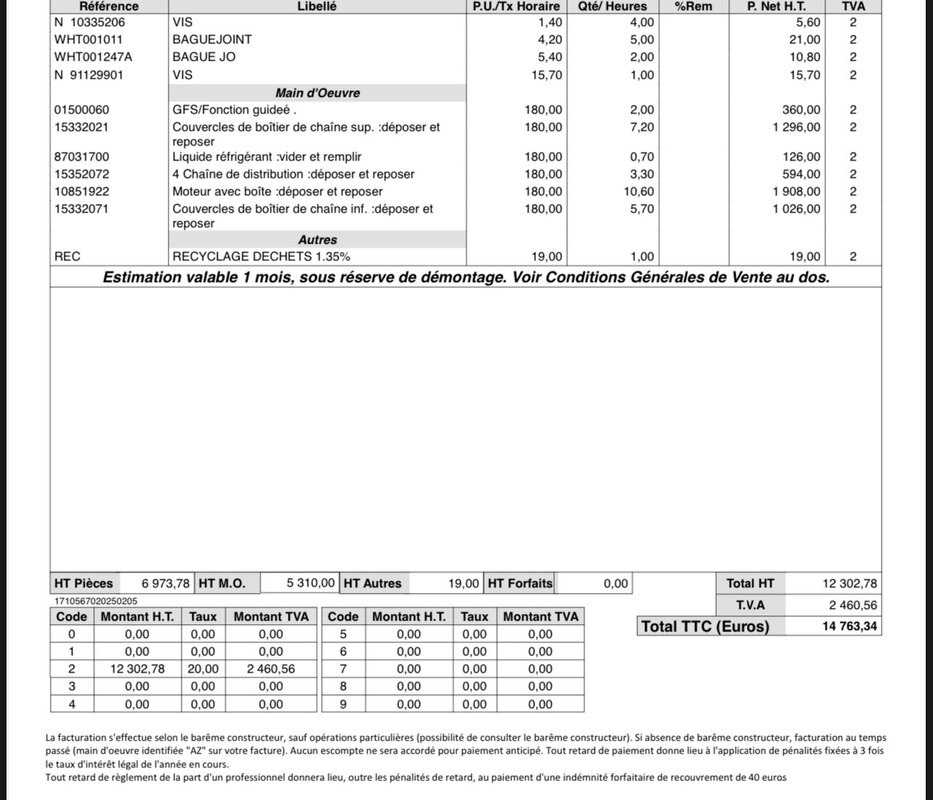 Oui ils ont pas eu besoin de descendre le moteur une facture total 1000 € Dans 300 € de pièces 😁👍🏾 Au lieu de 14 700 € -