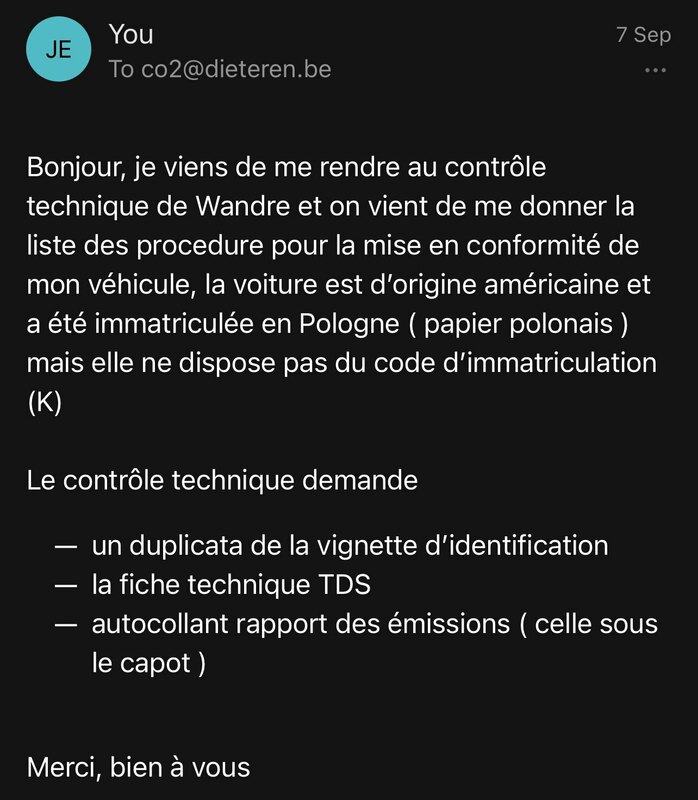 2. Bonjour, je viens vers vous car j'ai un assez gros problème et j'aurais aimé savoir si quelqu'un a déjà eu le cas ou saurait m'aider Je suis de Belgique et j'ai décidé d'acheter une Audi S4 de 2013 il y a quelques mois en Pologne, la voiture est d'origine USA, je m'étais renseigné avant de l'acheter et j'avais cru comprendre que si la voiture avait été immatriculée en Europe les démarches était assez simple, un dédouanement banal, SAUF QUE La voiture étant polonaise et d'origine USA elle n'a pas de COC ce qui est normal mais je n'avais pas remarqué qu'il me manquait le code K qui correspond au numéro d'identification du véhicule, plaquette constructeur qui était censé être (d'après le gars du contrôle technique) dans l'intérieur de la portière conducteur. Ce qui rendait le contrôle technique impossible, de plus, on me demande de faire un contrôle après accident et de faire toutes les démarches comme si la voiture n'avait jamais été immatriculée en Europe (la ça commence à poser problème) On me demande : - Duplicata plaquette d'identification constructeur - Fiche technique TDS - Autocollant rapport des émissions co2 (qui est sous le capot apparemment) Je vais donc en concession Audi de Wandre, la personne me dit qu'ils ne savent rien faire car la voiture n'est pas européenne et que je dois voir avec la concession d'où la voiture vient ( de Washington lol ) Je trouve sa dingue qu'une marque comme Audi n'ont pas une base de donnée pour savoir récupérer ce fameux numéro qui doit quand même être lié au numéro de châssis ... Est-ce que quelqu'un saurait m'aider et trouver une solution à mon problème ? Merci d'avance