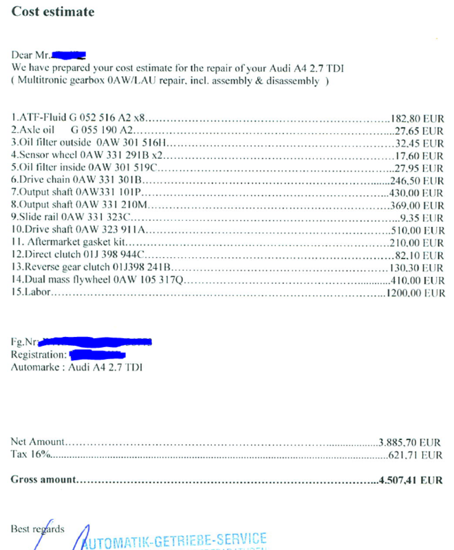 Bonjour tout le monde, J'ai eu un souci avec ma boite hier matin alors que je roulais en Allemagne, grosso-modo la voiture ne voulais plus s'élancer en position D alors que je venais de démarrer, même après tenter d’accélérer. La marche arrière elle marchait bien. j'ai donc reculé et me suis mis dans le sens de la pente pour pouvoir repartir, puis sur la route des secousses / à coup ressentis alors que j’étais au régulateur a 120. Du coup j'ai roulé un peu et j'ai déposé ma caisse dans un garage dont j'avais entendu parler ici et sur d'autres forum (audimultitronic.de) qui était pas loin de là ou j'étais. le garage était ouvert le samedi donc j'ai attendu l'ouverture. La titine a 194 000 kms et le type du garage m'a dit que ce genre de souci est fréquent (souci probable avec el circuit hydraulique et/ou lamelles ou variateur +chaine usées. Bref : environ 3000 euros de reparation selon eux, j'attend plus de precision lors du démontage , je dois attendre le Go de mon service garantie panne (eurola.fr). Je vous tiens au courant. En tout cas je suis content car en France ca aurait couté bien plus cher je pense... -