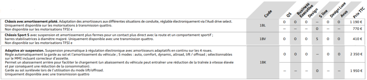Il a en fait 3 options différentes (pourquoi faire simple...) : - Châssis Sport - Châssis avec amortissement piloté (parfois appeler "Magnetic Ride" à priori) - Suspensions pneumatiques ou "Adaptive Air Suspension" Sur L'A5 pas de suspensions pneumatiques possible (voiture de pauvre ) Sur le Q5 par contre vous avez le choix des trois mais pas en TFSI e à priori... : J'ai fait ça bien vous avez même les codes pour les options