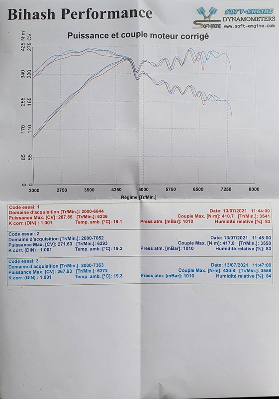 Bonjour à tous, Je suis propriétaire d'une A4 B8 2.0 TFSI 211chevaux depuis maintenant quelques mois et début juin j'ai procédé à une reprogrammation moteur stage 1 et Flex fuel chez PERFORM ENGINE à Tertre en Belgique (dont je n'ai entendu que du bien). J'ai parcouru environ 1000 à 1500 kms avec le véhicule depuis je ne rencontre aucun soucis avec le véhicule mais le programmateur ne disposant pas d'un banc 4 roues motrice je passe près de chez moi le véhicule sur banc de puissance chez BIHASH PERFORMANCE, et là ce programmateur m'informe d'un gros soucis avec le véhicule : absence de point de rupture et une courbe à faire peur pour des résultats très correct à savoir 410 NM pour 267 Chevaux. Je recontacte donc le programmateur qui entre en contact avec le propriétaire du banc qui me re-apelle pour m'expliquer que je doit simplement mettre des bougies iridium NGK et que le problème sera réglé. Qu'en pensez-vous ? Je vous joint le graphique
