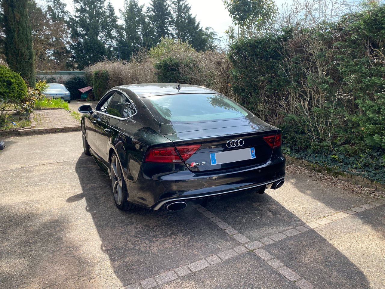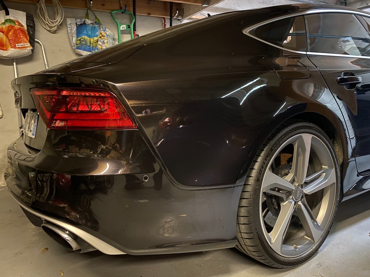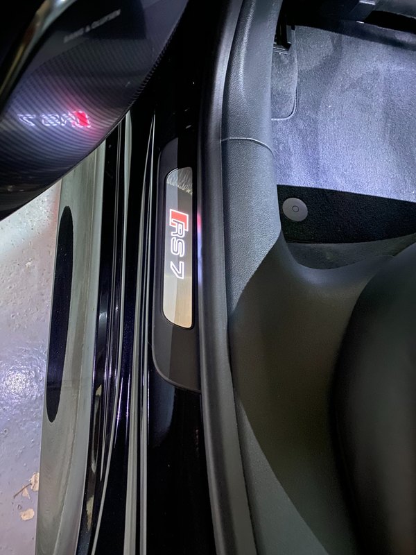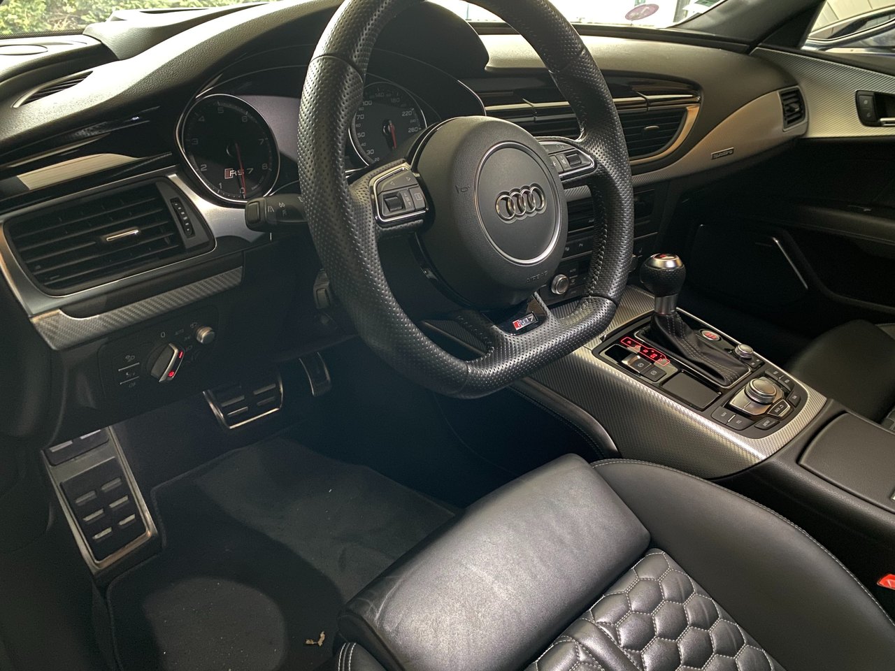 salut à vous, alors je prends enfin un peu de temps pour vous présenter en détail cette bestial RS7 : après avoir loupé un modèle 2015 (facelift) avec seulement 32 000 kms (orgine allemagne, 1ère main, intérieur audi exclusive, suppression du TO, dommage, et pas mal d'options sauf la vision nocturne) j'ai contacté dans la foulée une concession qui avait une RS7 depuis plusieurs semaines/mois : c'est un modèle 2014 de 47000kms, seconde main et qui est plutôt bien garni : - fermeture assistée des portes - double vitrage avec isolation phonique, thermique et protection anti effraction - sièges AV et AR chauffants - son B&O - affichage tête haute -rideau pare soleil lunette arrière - corner view - vision nocture -audi pre sense plus - pack dynamique - pack aluminium - charger 6CD/DVD - télécommande homelink - reception radio DAB - Sellerie cuir Valcona j'ai le câble qui se connecter à l'AMI, le filet dans le coffre, la trousse de secours dans l'accoudoir arrière. mon retour, malgré la fatigue s'est super bien passé, limite trop court malgré les 700 bornes. le véhicule est souple, agréable avec une consommation plus que raisonnable vu le moulin qu'elle a (j'ai fait du 9l/100kms en moyenne avec quelques démarrages sympas. le COD fonctionne bien, juste quelques à-coups lorsqu'elle revient sur 8 cylindres. je n'ai pas eu le temps de faire tous les réglages qu'elle offre ni un nettoyage convenable, ça passe trop vite le temps du coup, si un modérateur passe par là, le titre du poste peut être changé en 'j'ai trouvé le graal' au plaisir de partager davantage, j'aurai surement d'autres choses à dire et à montrer dans les jours qui suivront