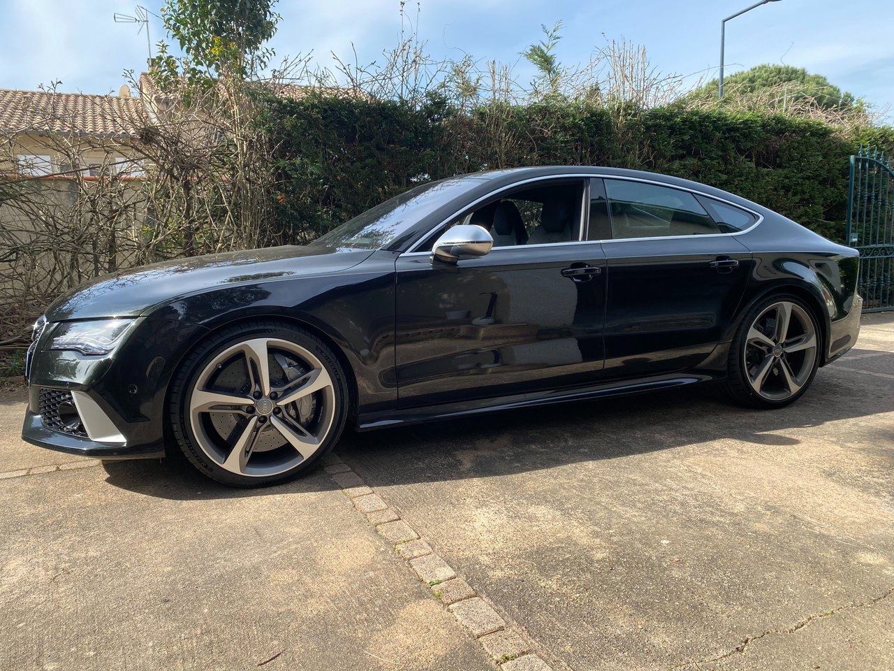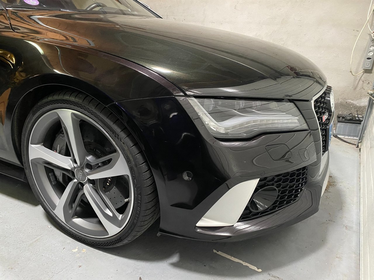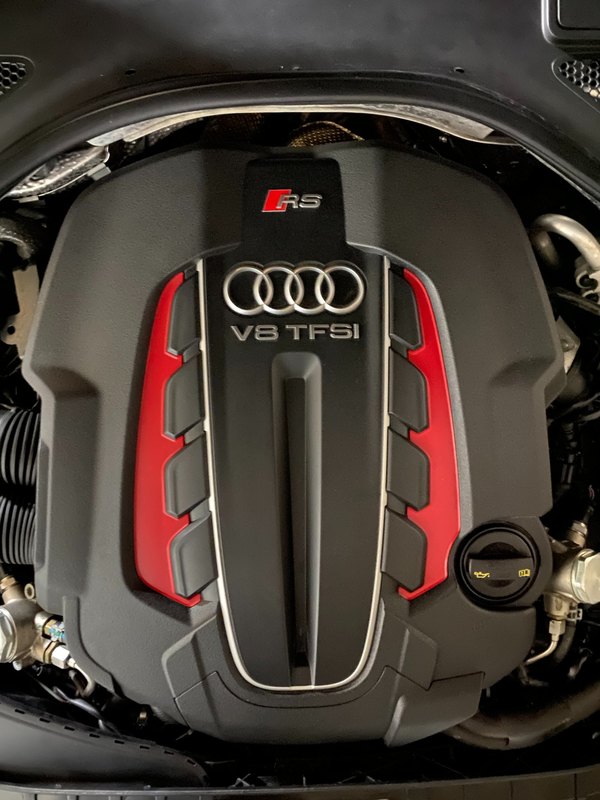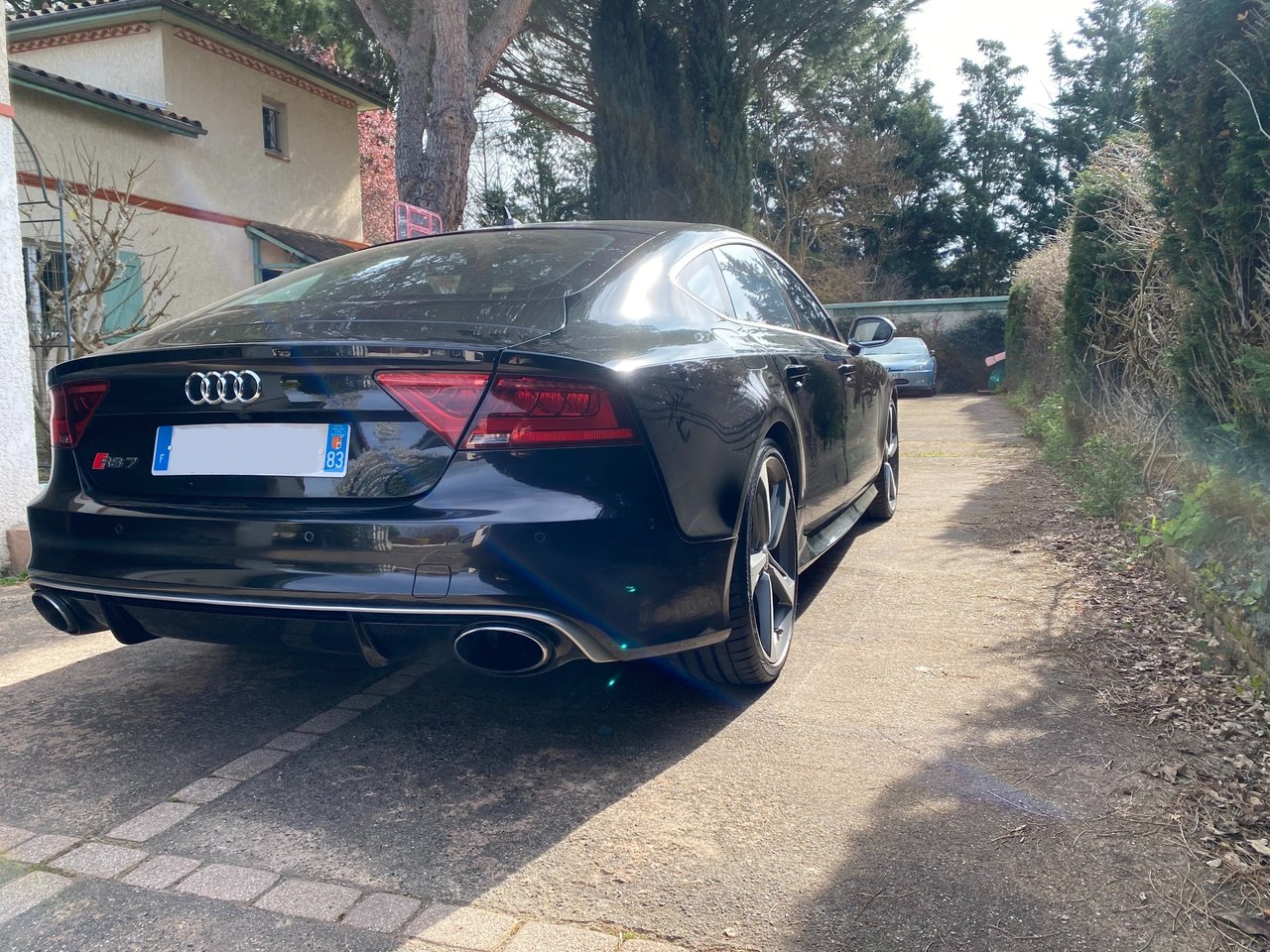 salut à vous, alors je prends enfin un peu de temps pour vous présenter en détail cette bestial RS7 : après avoir loupé un modèle 2015 (facelift) avec seulement 32 000 kms (orgine allemagne, 1ère main, intérieur audi exclusive, suppression du TO, dommage, et pas mal d'options sauf la vision nocturne) j'ai contacté dans la foulée une concession qui avait une RS7 depuis plusieurs semaines/mois : c'est un modèle 2014 de 47000kms, seconde main et qui est plutôt bien garni : - fermeture assistée des portes - double vitrage avec isolation phonique, thermique et protection anti effraction - sièges AV et AR chauffants - son B&O - affichage tête haute -rideau pare soleil lunette arrière - corner view - vision nocture -audi pre sense plus - pack dynamique - pack aluminium - charger 6CD/DVD - télécommande homelink - reception radio DAB - Sellerie cuir Valcona j'ai le câble qui se connecter à l'AMI, le filet dans le coffre, la trousse de secours dans l'accoudoir arrière. mon retour, malgré la fatigue s'est super bien passé, limite trop court malgré les 700 bornes. le véhicule est souple, agréable avec une consommation plus que raisonnable vu le moulin qu'elle a (j'ai fait du 9l/100kms en moyenne avec quelques démarrages sympas. le COD fonctionne bien, juste quelques à-coups lorsqu'elle revient sur 8 cylindres. je n'ai pas eu le temps de faire tous les réglages qu'elle offre ni un nettoyage convenable, ça passe trop vite le temps du coup, si un modérateur passe par là, le titre du poste peut être changé en 'j'ai trouvé le graal' au plaisir de partager davantage, j'aurai surement d'autres choses à dire et à montrer dans les jours qui suivront