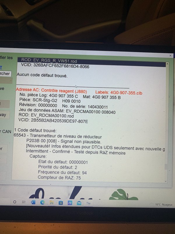 Salut, à mon avis tu a le même style de problème que moi. Le système adblue qui fait des siennes. Si c’est ça, d’après ce que j ai compris tu peut rouler, le système et indépendant il sert juste à réduire la toxicité des gaz quand le fap régénère. Moi c est la sonde du niveau de liquide qui est en défaut, qui est sur la pompe et la pompe vaut 1000 euros et on la trouve neuve que chez Audi. j’ai posté un sujet pour voir si je pouvais réinitialiser le système et comment pour voir si c est pas un bug sinon je suis bon pour une pompe. Mais c est vrai qu’avec un VCDS c’est le top. -