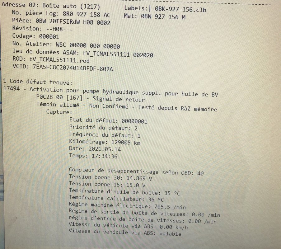 Bonjour Gérard, Effectivement c 'est fou cette manière de procédé par Audi mais après avoir discuté avec des spécialistes ZF il n'y à pas que Audi qui fait cela (uniquement pour les pièces de boite) mais toutes les marques Allemande (BMW, VV....) on peux trouver que les pièces dans la concession et le pire dans tous cela c'est que même si l'on trouve des pièces d'occasion Audi ne veux pas les reprogrammer (Adaptation VCDS) car ce ne sont pas eux qui on monté la pièce. Qu'entend tu par reset logiciel? Ce que j'ai fait c'est effacé le défaut avec VCDS mais après un nouveau scan il est ressorti. Je suis aussi allée dans l'onglet boite et l'est effacé directement mais même souci. J'ai fait des recherche pour une adaptation du mécatronique mais j'ai trouvé que des explications pour les boites dsg et rien sur boite tiptronique 8vitesses qui équipe mon véhicule. Je repousse de plus en plus cette partie adaptation car je n'est pas encore toutes les connaissance sur le sujet et si je me trompe adieu la boite . -