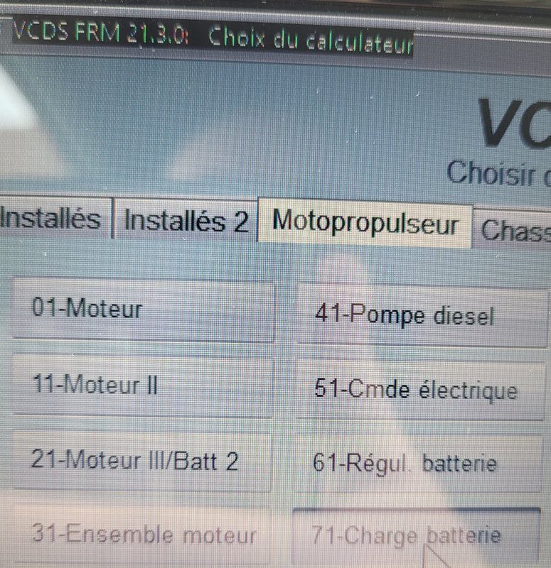 4. Bonjour J aimerais trouver une aide à l utilisation en particulier pour accéder aux calculateurs. Par exemple comment coder la batterie si ce n est pas dans les calculateurs installés 1 et 2 ? Je ne comprends pas n ont plus pourquoi les calculateurs 61 et 71 en tre autres ne sont pas installés ? Idem pour attache remorque . Merci.