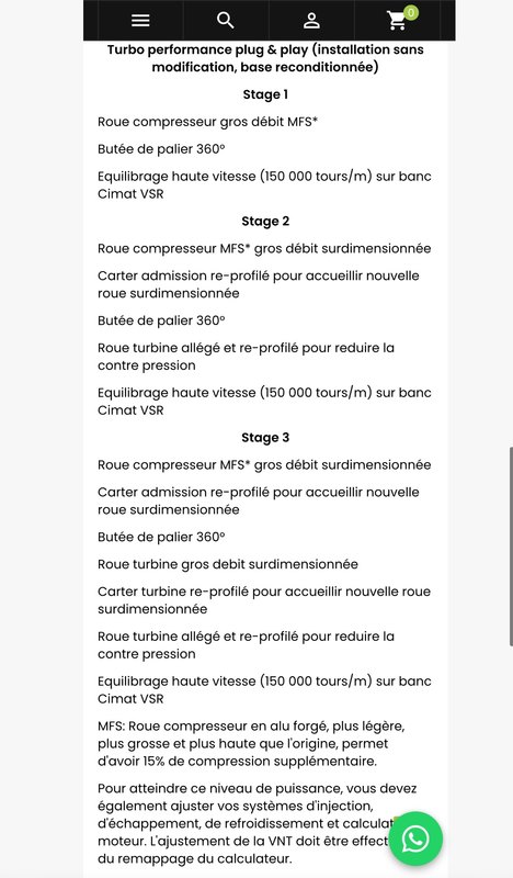 Là j’ai trouver pour 372€ ou 612€ en stage 2 pour un turbo hybride sa reste plutôt pas mal au vue des caractéristiques qu’il propose ? après ces sur que juste le CHRA coûte 88€ sa change tout 😅 -