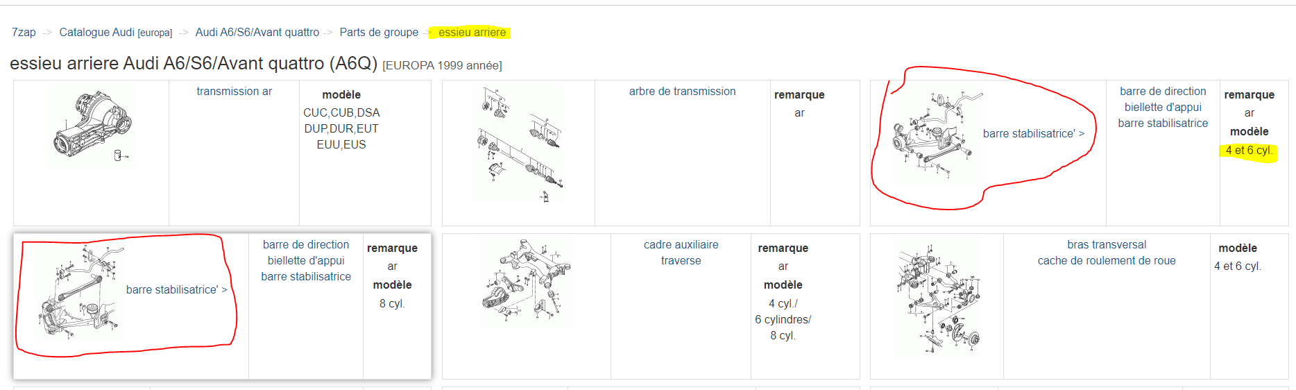 Je me suis basé sur les shémas et ce qui resembler le plus à la pièce rechercher : https://audi.7zap.com/fr/rdw/audi+a6+s6+avant+quattro/a6q/1999-262/5/ sans compter que j'ai été voir une conaissance qui vends des pièces auto pour la référence (j'ai pas le premium sur le site) mais la référence ressemble beaucoup et le kit ebay à +400€ ces exactement la même pièce. Quand je parle de silent bloc je parle de ça : Aucune idée ! Elle est de 1999 pour ma part A6 C5 4b2 2.5 tdi Quattro Série 2 150CV -