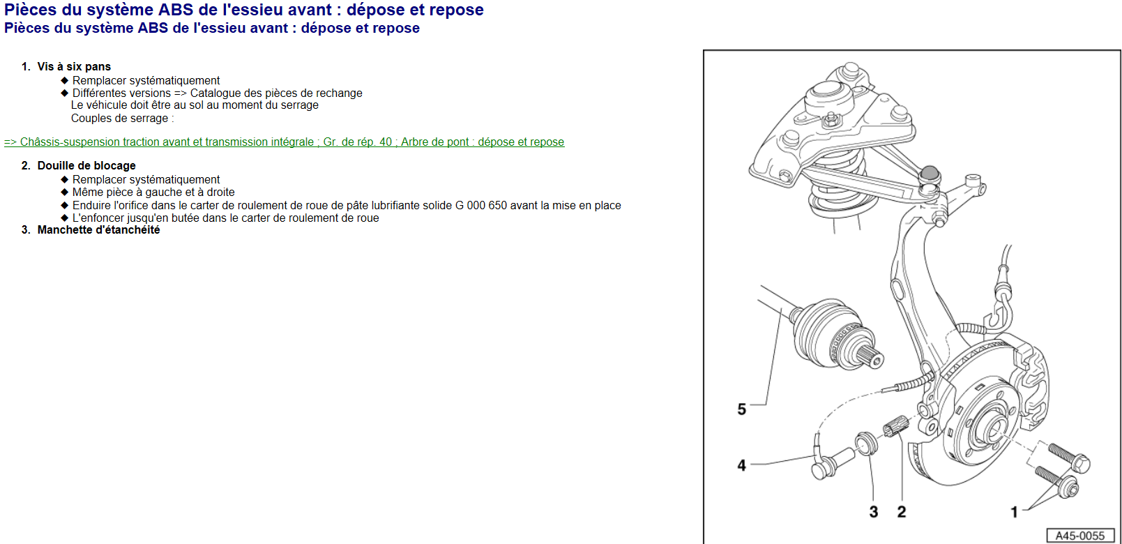 Salut @Tissa33620 Merci à vous, je viens juste de la commander sur la bay comme @K12 me l'a recommandé. Celle qui m'a été livrée avec la barre de calages des AAC correspond en faite au T40069 pour les moteurs 2.4, 3.2, ou même 2.8 en filetage de diam. 14mm. Alors que c'est vendu pour du V8 AQJ, ANK, entre autres. Donc si jamais vous avez besoin de caler un 3.2 @Abba ou @K12 @boris.h Et @djbilbao je ne suis pas le mieux placé pour répondre je pense que d'autres, comme @stinger, maîtrisent le sujet plutôt bien. Sinon je recherche le support moteur frontal ref. 4D0199267 si jamais quelqu'un a un site ou une ref. peut-être en Powerflex ? -