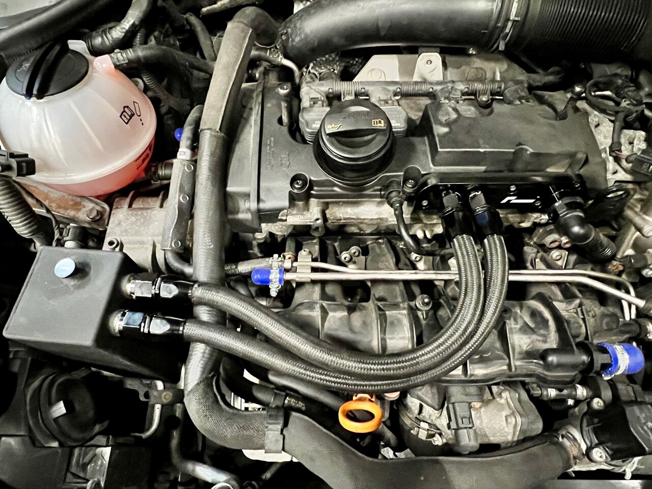 Oui j’ai d’autres idées bien sûr, le tableau de bord en alcantara ça serait sympa par exemple mais gros budget, et au bout d’un moment je ne peux pas mettre toutes mes ressources que sur ça…faut faire des choix. j’ai également le châssis à refaire, j’ai presque 3500€ de pièces dans le garage qui attendent à cet effet. Dernière modification en date, installation d’un récupérateur de vapeur d’huile (catch can). Nos moteurs tfsi sont loin d'être ce qu’il y a de plus fiable, entre autre à cause de l’encrassement provoqué par le mécanisme de la vanne pcv. Je l’ai donc supprimé. pour bien faire, pour finir de fiabiliser, j’aimerai supprimer l’arbre d’équilibrage, source de beaucoup de casse moteur, c’est un peu plus compliquer à faire mais c’est prévu ! -