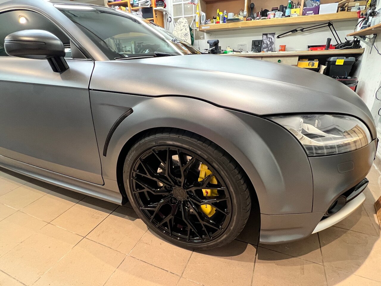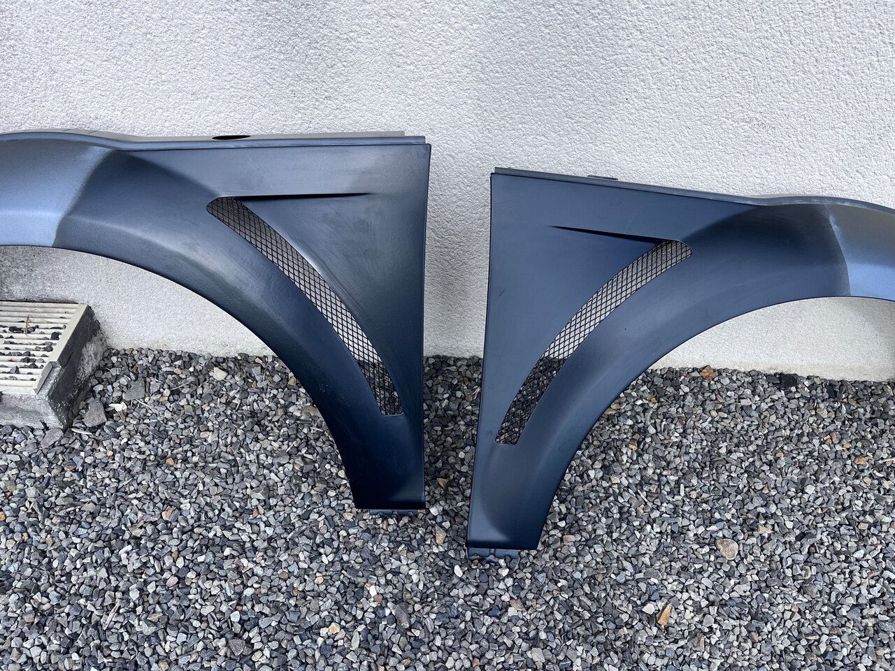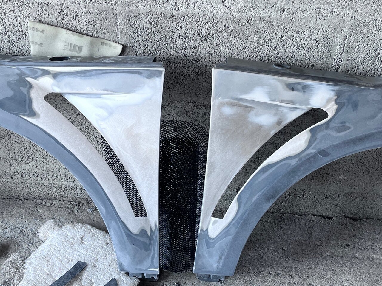 Merci pour vos retours, quelques photos de la réalisation… c’est de l’artisanat ! découpe Ponçage mise en apprêt (les grilles sont déjà collées) Passage en cabine Ça paraît facile finalement comme ça ! Difficulté rencontrée: le bocal de lave glace est situé dans l’aile gauche sur le TT, et avec l’ouverture de l’aile, pas possible de le conserver ici il a donc fallu le déplacer, Remplacé par un bocal d’A3 8P, il a trouvé sa place juste derrière le pare choc à gauche, avec les rallonges de durites d’eau et de connecteurs électrique à prévoir. -