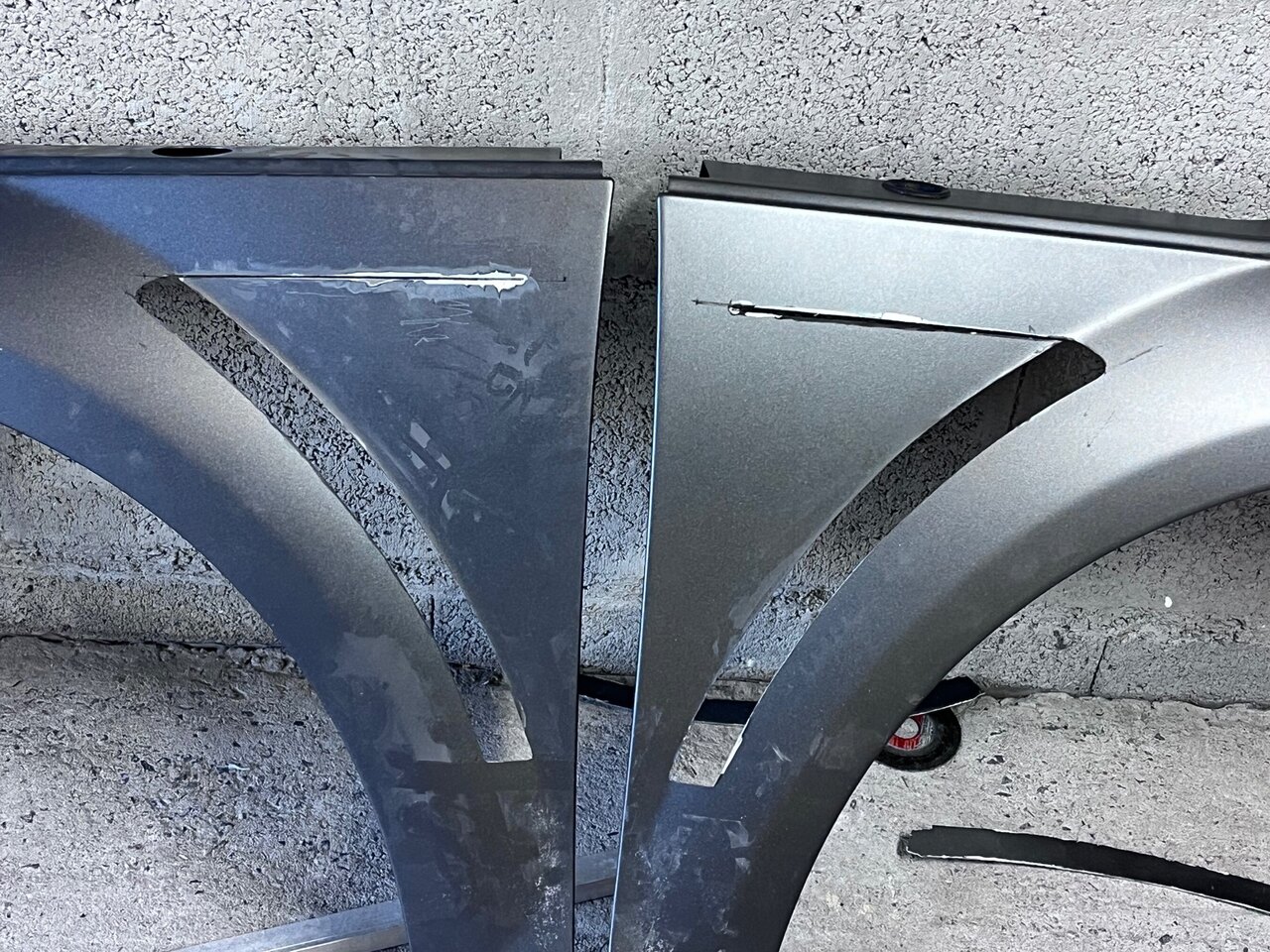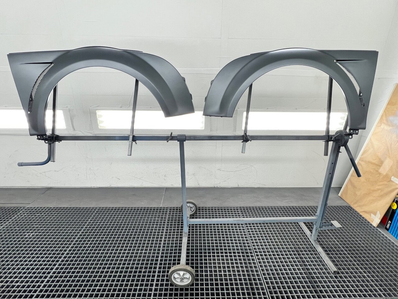 Je ne sais pas d’où vient le grillage, je peux demander si tu veux. Je n’ai pas fait de photos de la partie invisible, celle qui est derrière. Le grillage a été fixé avant avec de la résine epoxy si je me souviens bien (les ailes sont en alu). J'ai donc du cacher ça avant de les faire peindre, cependant il aurait été plus logique de les mettre en place après la peinture, mais celui qui a fait les ailes n’est pas celui qui les a peintes… il reste un petit détail qu’il faudra que je peaufine, on aperçoit maintenant la partie cachée du pare-boue…qui est gris foncée. Je pense repeindre cette partie en noir, reste à trouver la peinture qui va accrocher sur cette matière (une sorte de tissu). -