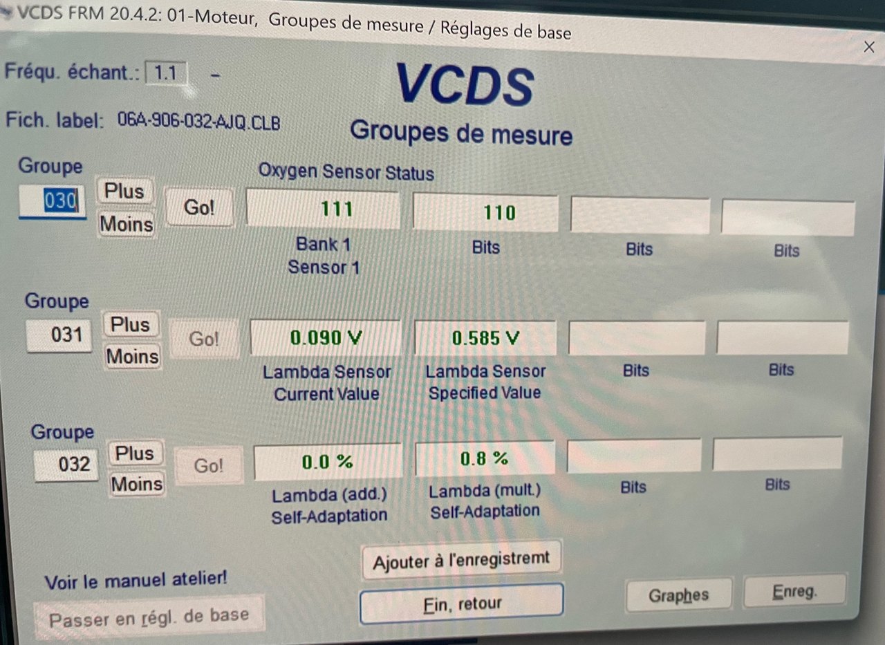 Bonjour à tous, 1/ J'ai reçu le capteur G200 et G202 et ils ont été montés dans la foulée. J'ai réussi à effacer les deux erreurs avec le vagcom et le voyant s'est éteint. Cependant après un essai rapide sur la route j'ai la voiture qui se met à freiner toute seul et le voyant s'allume de nouveau ... Après un passage au vagcom j'ai une erreur qui remonte sur le G202. Je bloque la ... vous avez des idées ? -> J'ai essayé de faire un réglage de base mais j'ai pas l'impression qu'il reconnait les composants. 2/ J'ai reçu aussi le bouton warning et les clignotants fonctionnent de nouveau 3/ Concernant le moteur si une âme charitable veut bien m'aider sur les ratés quand le moteur prend des tours ? (voir message ci dessous @djebee) Pour rappel, en remplaçant les bougies j'ai récupéré un moteur presque normal mais j'ai encore des petits ratés en 4/5 en reprise. Merci pour votre aide, bonne soirée ! Lucas.