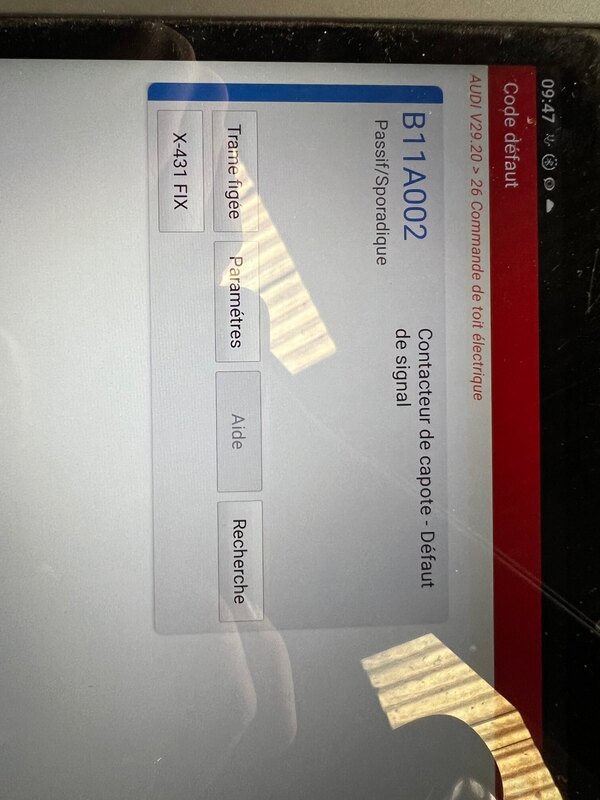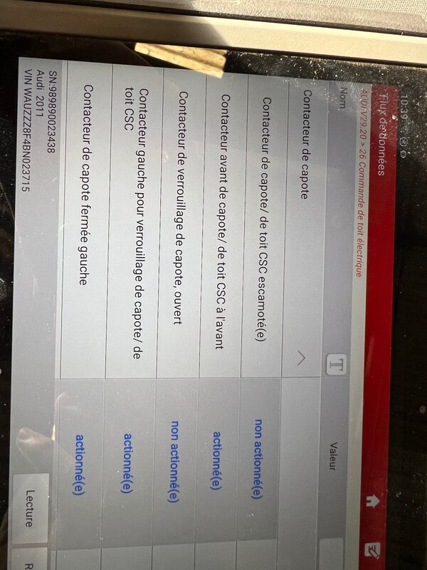 Bonjour à tous. Je viens vers vous car j'ai un problème de capote sur mon S5. Le défaut est le suivant : B11A002 Contacteur de capote - Défaut de signal Contacteur de capote / de toit CSC escamoté(e) Valeur (oscille entre) : Non actionnée / actionnée Ma question est de savoir de quelle capteur il s'agit.. Merci d'avance pour vos réponses.