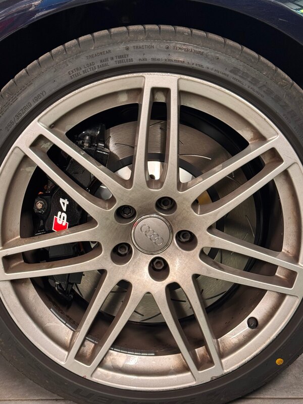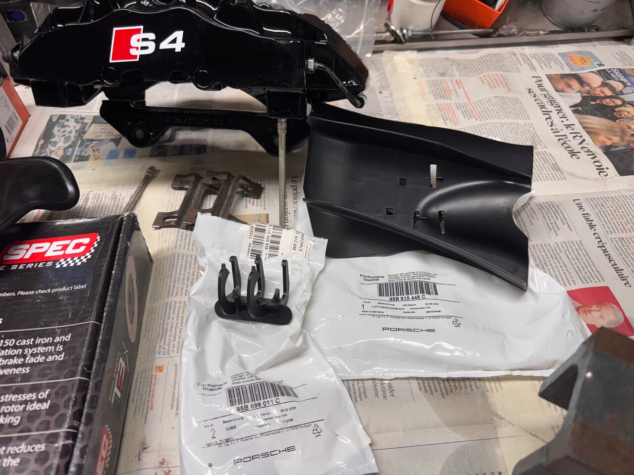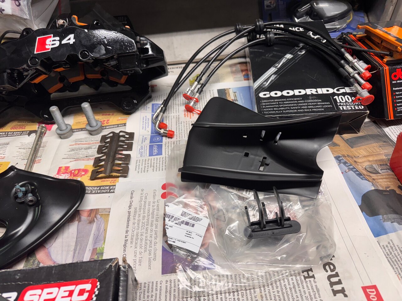 Suite au montage de l’upgrade du freinage avant. Je détail ma configuration sur mon Audi S4 B8 break de 2010 qui pourra peut être en aider ou éclairer certain. j’ai installé des étriers avant Brembo 8 pistons de RS6 (idem a certaines RS4 et RS5). Il faut vérifier la chape d’adaptation d’etrier qui doit avec la référence comme sur la photo ci-dessous pour pouvoir monter des disques en 365x34mm d’audi RS5. J’ai acheté des disques de RS5 modèle 2011 2 parties (non flottant) en 365x34 non tulipé, et des plaquettes avant de RS5 chez DBA. J’ai acheté en neuf chez Audi les vis de fixation des chapes d’étrier de RS5 sur le moyeu, des caches poussière droit et gauche de RS5 + 2*4 vis de fixation des caches poussière et les kit vis de purge avec les capuchons ( le kit de vis de purge est vendu par paire, soit le nécessaire pour un étrier). Et des écopes de frein droit et gauche + partie arrière de fixation qui viennent sur les biellettes de direction pour Porsche Macan. Sur la photo ci dessous on voit normalement les références de la grande majorité des pièces. Puis montage de l’ensemble qui est plug&play, la seule adaptation a été de recouper les écopes qui venait taper dans la barre anti-roulis quand on braque les roue à fond vers l’intérieur. Les photos ci-dessous sont le côté droit (passager) Avec mes jantes en 19’´, je n’ai pas eu besoin de recourir à des cales pour décaler les jantes vers l’extérieur, ça passe il doit rester environ 10mm de jeux entre l’étrier et l’intérieur des branches des jantes. -