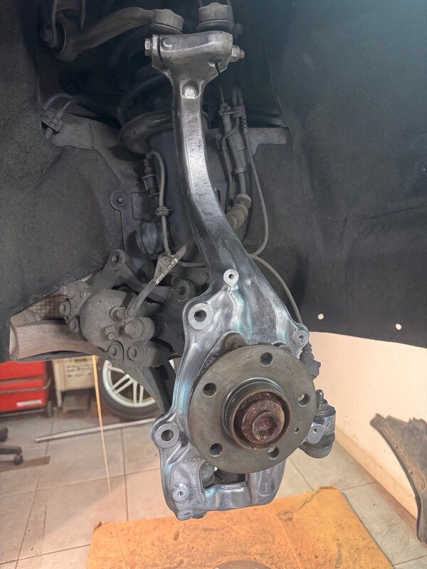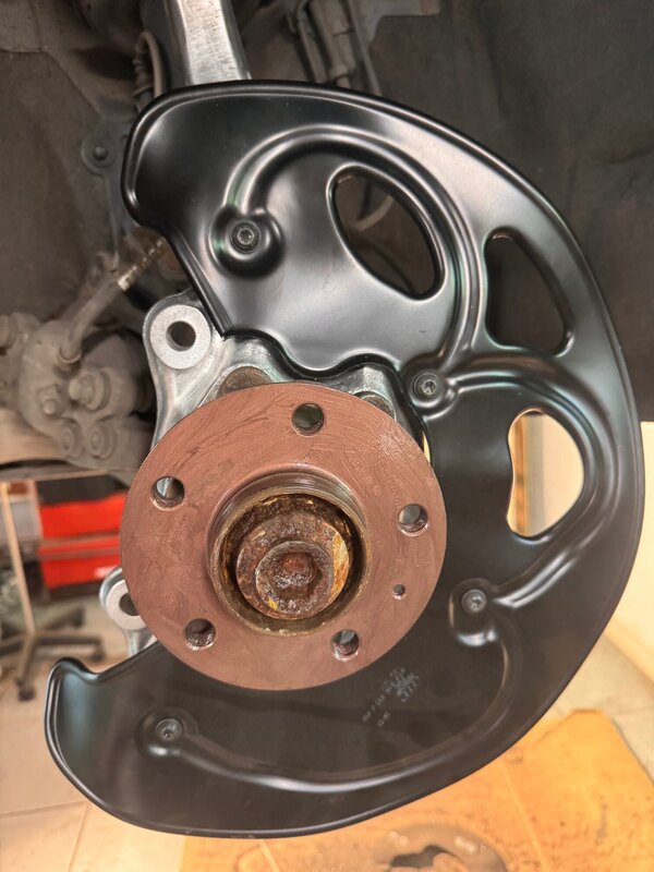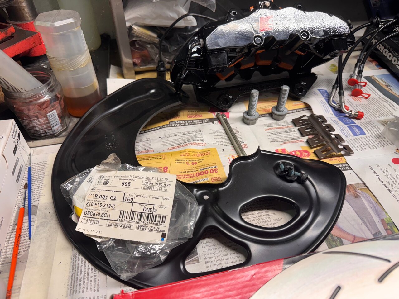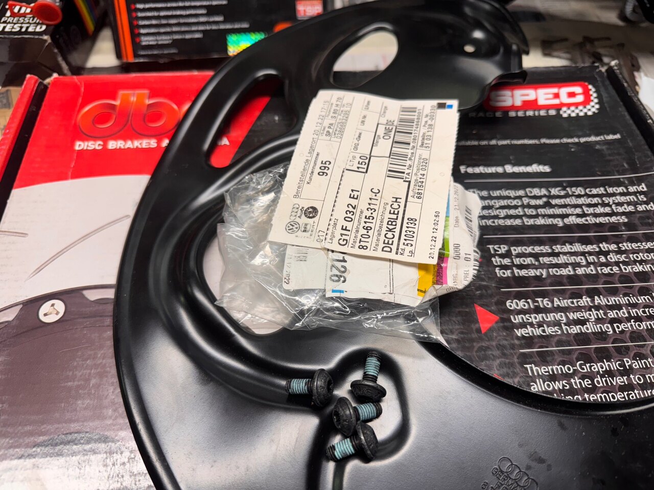 Suite au montage de l’upgrade du freinage avant. Je détail ma configuration sur mon Audi S4 B8 break de 2010 qui pourra peut être en aider ou éclairer certain. j’ai installé des étriers avant Brembo 8 pistons de RS6 (idem a certaines RS4 et RS5). Il faut vérifier la chape d’adaptation d’etrier qui doit avec la référence comme sur la photo ci-dessous pour pouvoir monter des disques en 365x34mm d’audi RS5. J’ai acheté des disques de RS5 modèle 2011 2 parties (non flottant) en 365x34 non tulipé, et des plaquettes avant de RS5 chez DBA. J’ai acheté en neuf chez Audi les vis de fixation des chapes d’étrier de RS5 sur le moyeu, des caches poussière droit et gauche de RS5 + 2*4 vis de fixation des caches poussière et les kit vis de purge avec les capuchons ( le kit de vis de purge est vendu par paire, soit le nécessaire pour un étrier). Et des écopes de frein droit et gauche + partie arrière de fixation qui viennent sur les biellettes de direction pour Porsche Macan. Sur la photo ci dessous on voit normalement les références de la grande majorité des pièces. Puis montage de l’ensemble qui est plug&play, la seule adaptation a été de recouper les écopes qui venait taper dans la barre anti-roulis quand on braque les roue à fond vers l’intérieur. Les photos ci-dessous sont le côté droit (passager) Avec mes jantes en 19’´, je n’ai pas eu besoin de recourir à des cales pour décaler les jantes vers l’extérieur, ça passe il doit rester environ 10mm de jeux entre l’étrier et l’intérieur des branches des jantes. -