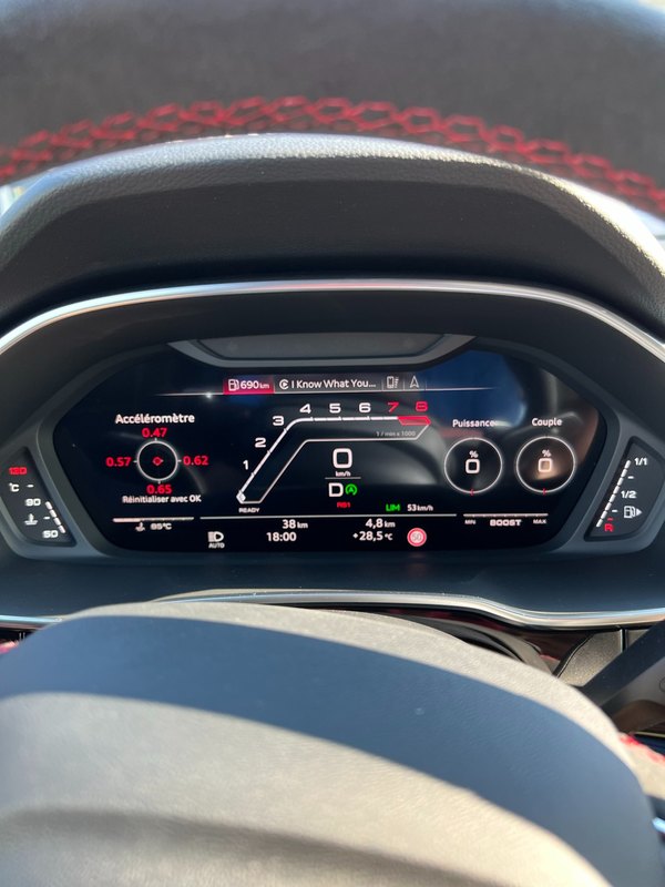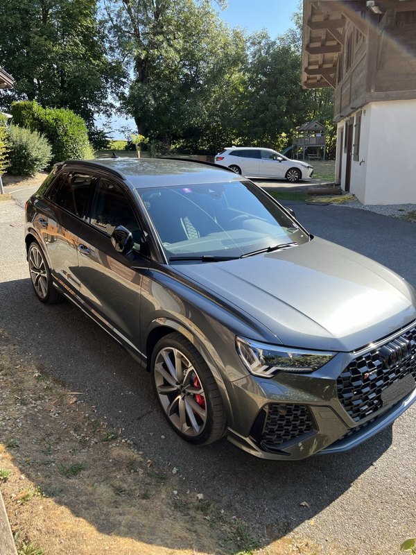 Hello à tous, Après une brève présentation dans la rubrique réservée à cet effet, voici plus de détail sur la responsable de ma venue sur ce forum ! Mais tout d'abord un peu de contexte : après plusieurs années passées sans véhicule, j'ai enfin pu me faire plaisir. Mon premier choix de raison a été une Golf 7 GTI que j'ai vraiment adoré : un châssis parfait pour ce que j'en faisais, une grande polyvalence et un moteur adapté à quasi toutes les circonstances. En plus, ici en Suisse c'est relativement discret et commun. Après trois années de bon service, j'ai cherché sa remplaçante. L'objectif était d'avoir un véhicule un peu plus familial. Mais également de se faire plaisir, la génération actuelle de véhicule semblant être la dernière avant le 100% politiquement correct électrique. J'ai donc visé non pas des modèles mais plutôt des motorisations au départ : le 5 cylindres Audi ou le L6 Bmw. Parce qu'un 4 cylindres même très bien optimisé c'est bien, mais plus c'est mieux (et encore une fois, ça risque de ne pas durer). Le premier véhicule essayé a été une nouvelle RS3, vraiment bestiale, mais pour l'objectif familial, on repassera (ce coffre digne d'une 107 ...). Restait dans la dernière course la Bmw 340i touring, le X3 40i et le RSQ3. Et c'est le Q3 qui a finalement eu notre choix en version classique (n'étant pas fan des SUV coupé). Commande passée en février 2022, livraison mi-août 2022 - je m'estime assez chanceux en terme de délai. En terme d'option, la voiture est assez complète (échappement sport, matrix, sièges sport ...). Ce qu'il manque principalement : Le toit ouvrant - petit regret pour ça Le pack d'assistance à la conduite avec le régulateur adaptatif + pour conserver le volant en Alcantara Les freins céramique - la voiture n'a pas vocation à faire du circuit / conduite énervée Et sûrement d'autres choses que j'oublie Mon ressenti après un peu plus de deux mois d'utilisation et environ 2'000 km: En plus : Le moteur est vraiment top - j'arrive à la fin du "rodage" et il n'a pas encore été exploité à 100% (si tant est qu'il le soit un jour) mais vraiment impressionnant Pour un SUV, le comportement est plutôt très bon - les vitesses de passage de courbe notamment Ca peut faire sourire pour un RS, mais l'habitabilité du Q3 est parfaite pour notre usage Les feux matrix top de nuit (ça change des xenons de la Golf) Un véritable confort en roulant normalement et quasi pas de bruit d'air aux vitesses légales sur autoroute En moins : La boîte parfois un peu rugueuse à froid Les feux matrix qui sont visiblement un peu trop efficaces sur l'autoroute et qui ont l'air d'éblouir les camions en face Sujet accessoire : ça consomme un peu (moyenne de 11/12L pour le moment). Mais vu le moteur et le poids, rien de bien étonnant. On verra ce que ça donne sur le long terme, mais je n'ai pas acheté ce véhicule pour faire des records de conso. Arrivons maintenant au sujet qui fâche réellement : la voiture tremble beaucoup sur autoroute à partir de 120. Le pare-soleil est par exemple pris de tremblement compulsif. J'ai déjà ramené la voiture deux fois à la concession - deux équilibrages ont été faits dont le dernier "parfaitement" selon l'atelier. La situation s'est améliorée mais ça reste trop important vu le prix du véhicule et pas confortable. Le garage me sous-entends qu'une des raisons est d'avoir des 21 pouces et qu'une RS ça tremble un peu ... C'est sûr que les pneus tailles baisses ne sont pas réputés pour leur confort mais ici on dépasse le supportable (selon mes critères) et je ne peux pas croire/admettre qu'un véhicule à ce prix là tremble à 130 au régulateur. Avez-vous déjà rencontré des problèmes similaires chez vous ? Prochaine étape : le passage aux jantes hiver avec du 19 pouces, on fera bien le comparatif. Si la situation vient bien des roues été, j'espère bien que le garage trouvera une solution. Et si c'est autre chose, et bien je ne préfère ne pas y penser ! Deuxième sujet qui semi-fache, la peinture a l'air de particulièrement marqué sur la face avant après les rencontres avec les insectes. Il va falloir que je nettoie ça à la main car les stations lavages ne suffisent pas. Si vous avez des recommandations de produit, je suis preneur Et pour vous remercier si vous avez bien lu tout ce pavé, quelques photos de la bête (il faudrait que j'en prenne plus ...) :