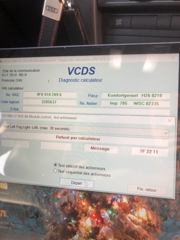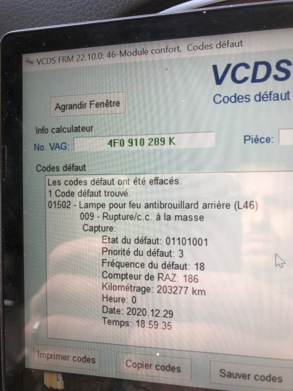 Bonjour. Je viens de me remettre sur mon soucis d'antibrouillards arrière. 1 ère chose: impossible via vcds de tester les antibrouillards arrière. D'ailleurs impossible de tester quoique ce soit dans le calculateur 46 module confort. 2 -ème chose: même en effaçant tous les défauts j'ai le défaut antibrouillard qui revient sans cesse avec une date d'il y a 2 ans avec défaut L46 donc lampe gauche mais ni la gauche ni la droite ne fonctionnent. -