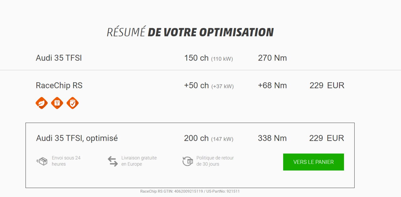 bonjour à tous. personnellement ,je viens de commander une A4 avant 2litres 35 TSFI S édition qui sera disponible pour décembre 2023......... j'ai pris le model 150 ch sachant que le 204 ch était exactement le même moteur mais avec un bridage électronique. J'ai dans l'idée de mettre une puce de chez Racechip :Model RS qui donne 50 ch de plus et 68Nm soit 200 chevaux qui est à peut près équivalent au 40 TSFI. L'avantage est qu'à priorique tout est réversible et qu'il n'y a juste juste un fusible à ôté pour un passage chez le concessionnaire ou bien contrôle pour un technique .Le prix est avantageux voir fiche en dessous pour le model choisit. j'ai déjà fait la même chose pour ma VW Passat 105ch qui est passée en 130 ch avec une consommation diminuée de pratiquement 1 litre et un agrément moteur bien supérieur. J'attends vos éventuelles remarques et réponses car je n'ai pas encore fait l'achat du boîtier tant que je n'aurais pas reçu mon véhicule! Par contre l'idée est la 😉 merci à tous et bon week end Éric